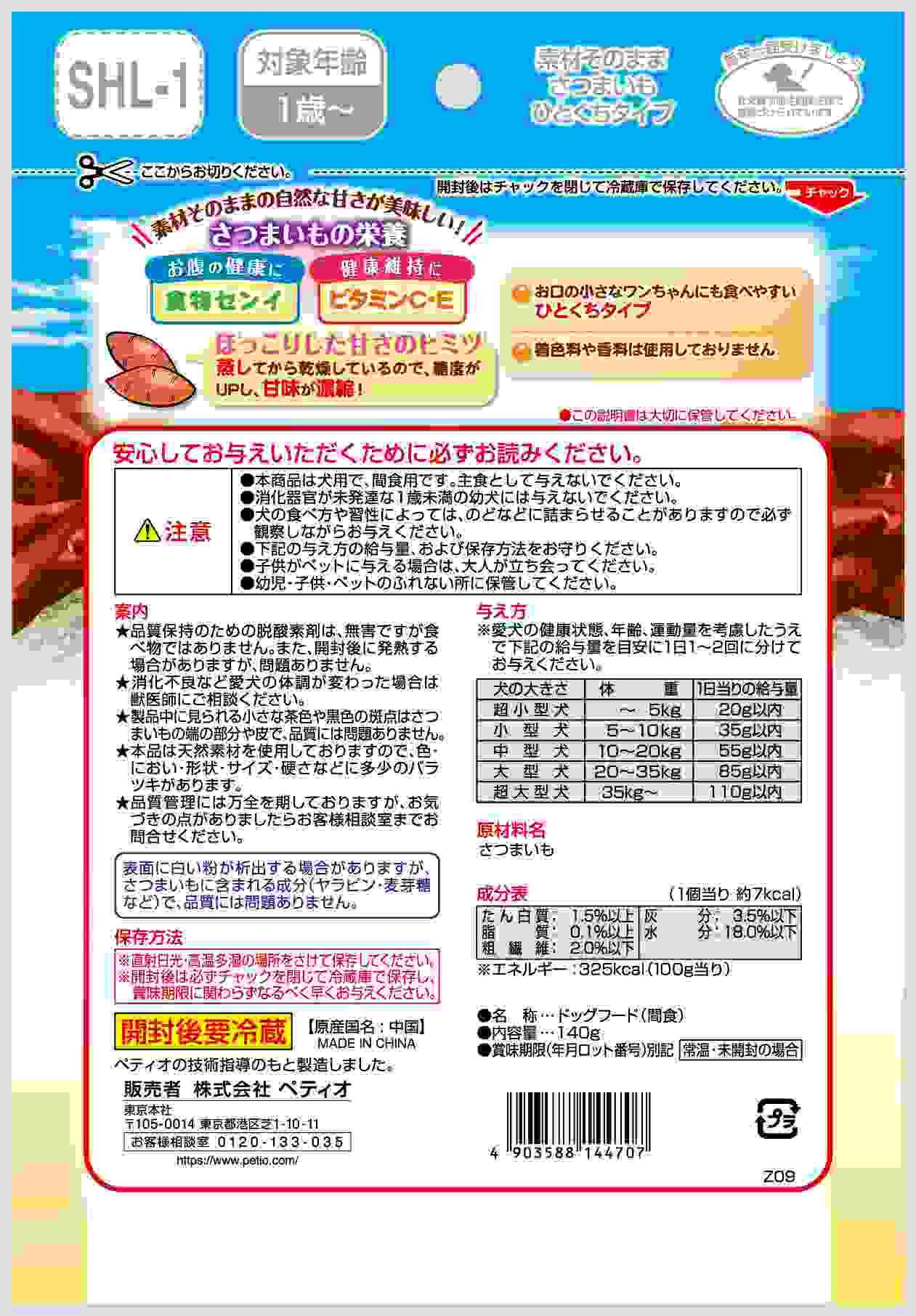 美味しい自然の甘さと、食物センイやビタミンC・Eなど栄養素がたっぷりと含まれるさつまいもをまるごと使用しました。お口の小さなワンちゃんにも食べやすいひとくちタイプ。着色料・香料 無添加。