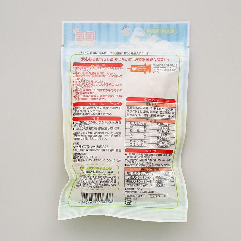 【与え方】 ・1日あたりの給与量は種類や体重、年齢、運動量等によって異なります。 ・生後6ヶ月未満(歯が生え揃っていない時期)には与えないでください。 ・のどにつまらせないよう注意してお与えください。 【保存方法】 ・直射日光、高温多湿の場所を避けて常温保存してください。 ・開封後は早めにお与えください。 【特長】 ・1袋(50g)にカルシウム105mgを配合しています。 ・1gあたり乳酸菌25億個を配合しています。 【注意】 ・本品は犬用です。犬以外には与えないでください。 ・与え方の給与量をお守りください。 ・幼児や子供の手の届かない所に置いてください。 ・保存方法をお守りください。 ・子供が与える時は、大人の看視のもとで行ってください。 ・黒い斑点は粉ミルク由来のものですので問題ありません。 ・消化不良など愛犬の体調が変わった時は、獣医師にご相談ください。 ※品質には万全を期しておりますが、万一製品にお気づきの点がございましたら、お客様相談室までお問い合わせください。