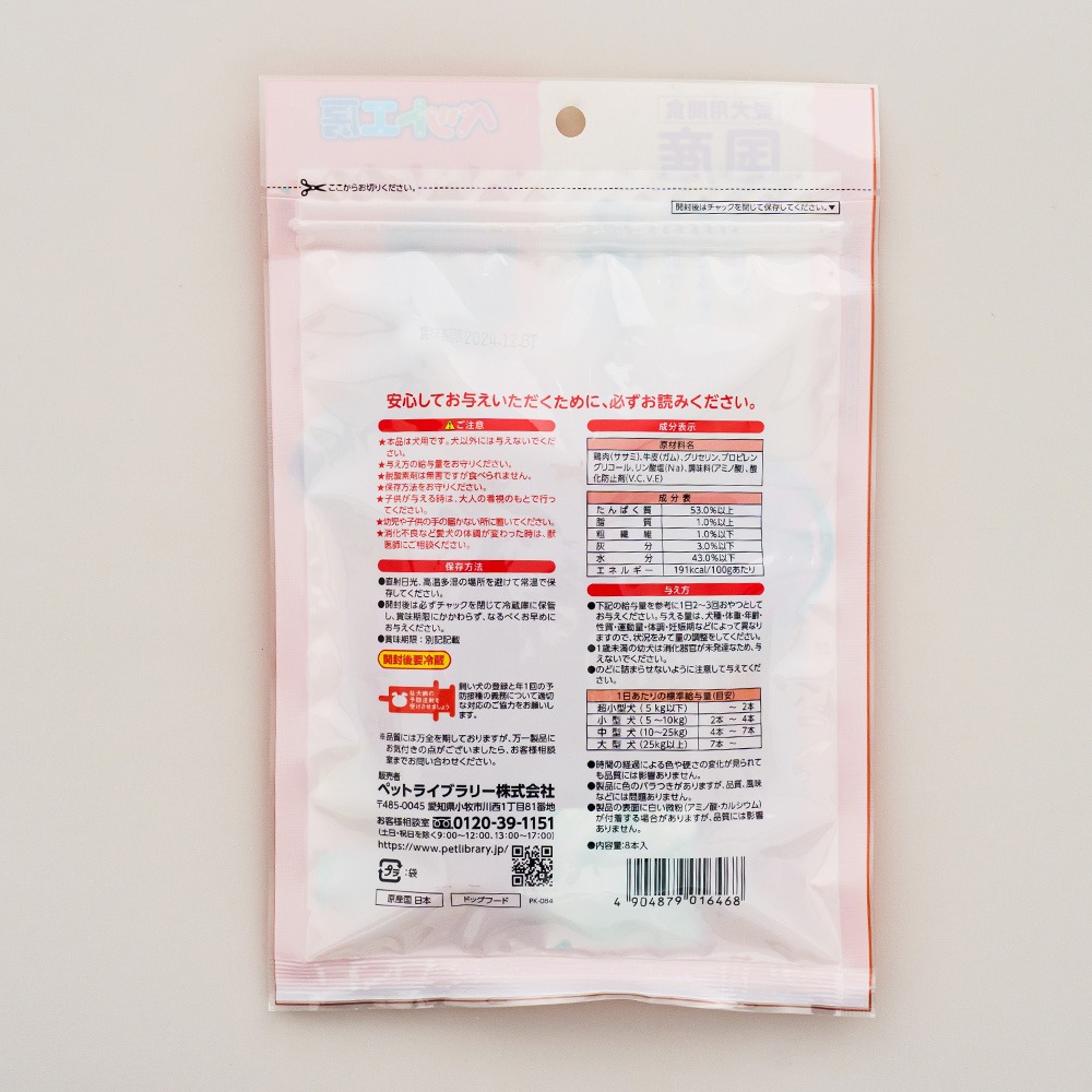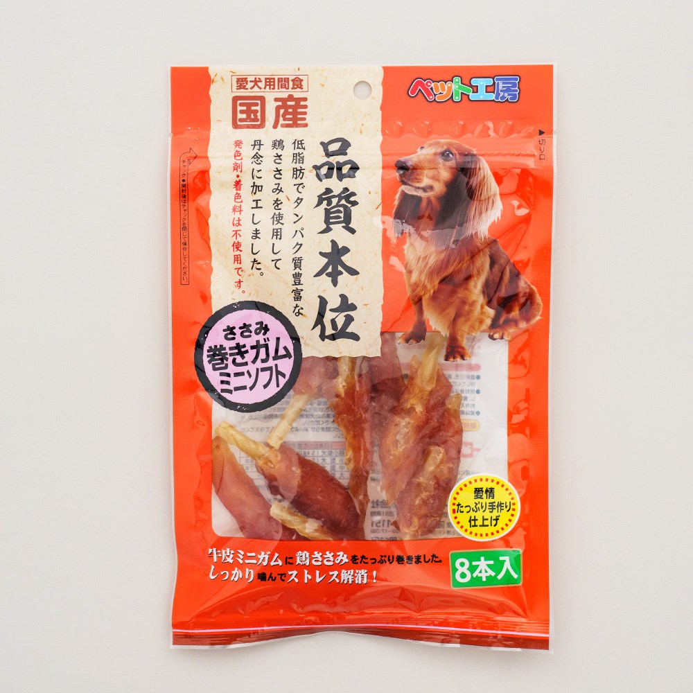 愛犬の歯垢や歯の汚れを取るガムと、おやつの主流であるササミを使用した商品で、2度美味しいスナックです。 低脂肪でタンパク質豊富な鶏ささみを使用して、丹念に加工しました。 発色剤・着色料不使用。 牛皮ガムに鶏ささみをたっぷり巻きました。 しっかり噛んでストレス解消! 愛情たっぷり手作り仕上げです。 【与え方】 ・裏面の給与量を参考に1日2~3回おやつとしてお与えください。 ・与える量は犬種・体重・年齢・性質・運動量・体調・妊娠期などによって異なりますので、状況を見て量の調整をしてください。 ・1歳未満の幼犬は消化器官が未発達なため、与えないでください。 ・のどに詰まらせないように注意して与えてください。 【保存方法】 ・直射日光・高温多湿の場所を避けて常温で保存してください。 ・開封後は必ず冷蔵庫で保管し、賞味期限にかかわらず、なるべくお早めにお与えください。 【注意】 ・本品は犬用です。犬以外には与えないでください。 ・保存方法と給与量をお守りください。 ・子供が与える時は、大人の看視のもとで行ってください。 ・幼児や子供の手の届かない所に置いてください。 ・消化不良など愛犬の体調が変わった時は、獣医師にご相談ください。 ・脱酸素材は無害ですが、食品ではありません。