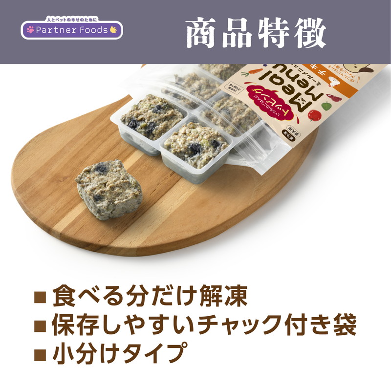 チキンをメインに野菜や果物が入ったメニューです。 鶏むね肉やたんぱく質・鉄分・亜鉛・ビタミンAを含む鶏レバーを使用し、βカロテン・ビタミンAを含むブロッコリーやニンジン、アントシアニンを含むブルーベリーなどを使用したこだわりごはんに仕上げました。 【アレルギー】鶏肉、りんご
