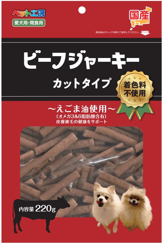 無着色のビーフジャーキーです。 【与え方】 ・1日2~3回、おやつとしてお与えください。 ・与える量は犬種・体重・年齢・性質・運動量・体調・妊娠期などによって異なりますので、状況を見て量を調節してください。 ・生後6か月未満(歯が生え揃っていない時期)には与えないでください。 ・のどに詰まらせないよう注意してお与えください。 ※時間の経過による色や硬さの変化が見られても品質には影響ありません。 ※製品の表面に白い微分(アミノ酸・カルシウム)が付着する場合がありますが、品質には影響ありません。 【注意】 ・本品は犬用です。犬以外には与えないでください。 ・与え方の給与量をお守りください。 ・脱酸素剤は無害ですが食べられません。 ・保存方法をお守りください。 ・子供が与える時は、大人の看視のもとで行ってください。 ・幼児や子供の手の届かない所に置いてください。 ・消化不良など愛犬の体調が変わった時は、獣医師にご相談ください。 ・直射日光、高温多湿の場所を避けて常温で保存してください。 ・開封後は必ずチャックを閉じて冷蔵庫に保存し、賞味期限にかかわらず、なるべくお早めにお与えください。