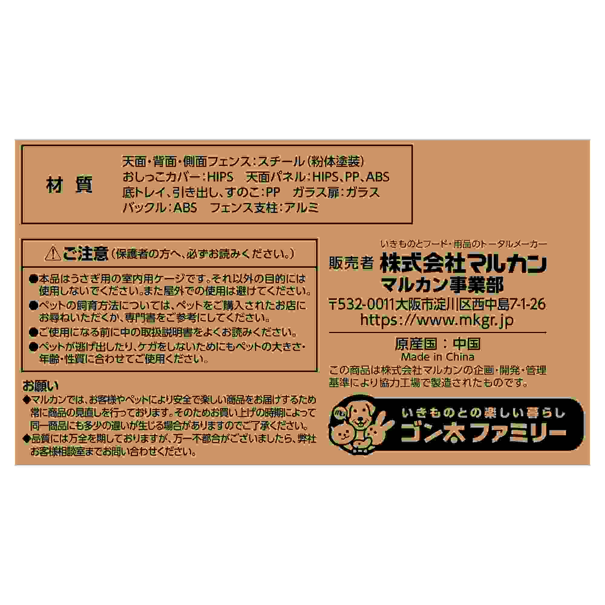 ●セット内容がすべて揃っていることを、組み立てる前に確認してください。 ●本品はうさぎ専用の室内用ケージです。他の目的には使用しないでください。 ●ペットが逃げないよう、以下の点にご注意ください。[ 扉は確実にロックしてください。/各パーツにスキ間やゆるみがあれば直し、安全をご確認のうえで使用してください。/ペットが逃げたり、フェンスやガラス扉のスキ間にはさまったりする恐れがある場合には、使用を中止してください。] ●ケガや破損ほかの事故がないよう、以下の点にご注意ください。[破損のある場合は使用しないでください。/必ずトレイの底を持って移動してください。/平らで安定した場所に設置してください。/落下のほか、強い衝撃を与えないでください。/上に重いものをのせないでください。/お子様がいたずらしないようご注意ください。/フェンスの角やワイヤーの端でケガをしないようにしてください。] ●火気や暖房機具のそばに置かないでください。火災や火傷などの原因になります。 ●記載事項を守りながら、安全に使用してください。 ●ペットの詳しい飼育方法はペットショップなどで尋ねられるか、専門書を参考にしてください。 ※幼いペットや小さいペットにご使用いただく場合は、すのこの穴に脚が引っかかる恐れがありますので、ご注意ください。