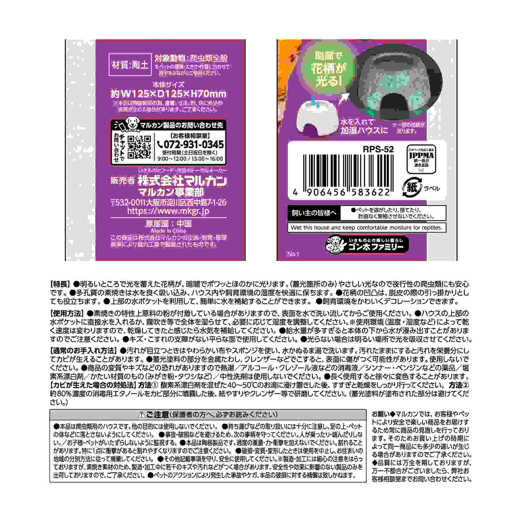 ●本品は爬虫類用のハウスです。他の目的には使用しないでください。 ●持ち運びなどの取り扱いには十分に注意し、足の上・ペット の体などに落とさないようにしてください。 ●事故・破損などを避けるため、次の事柄を守ってください。人が乗ったり・踏んだりしな い。/お子様・ペットがいたずらしないように監視する。 ●本品は陶器製品です。過度の重量・力・衝撃を加えないでください。割れること があります。特に1点に衝撃があると割れやすくなりますのでご注意ください。 ●破損・変質・変形したときは使用を中止し、お住まいの 地域の分別方法に従って廃棄してください。 ●その他記載事項を守り、安全に使用してください。※製造・加工には細心の注意をはらっ ておりますが、素焼き素材のため、製造・加工中に若干のキズや汚れなどがつく場合があります。安全性や効果に影響のない製品のみを 出荷しておりますので、ご了承ください。 ●ペットのアクションにより発生した事故やケガ、本品の破損に対する補償は致しかねます。