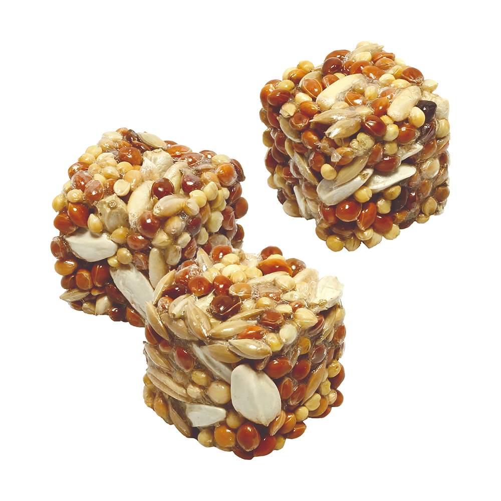 キューブ型のつまめるおやつ。小動物の大好きな5種のシードをぎゅっと一粒に!おなかの健康をサポートする乳酸菌“フェカリス菌”&ハチミツ入り。小動物がおててに持ってかじかじ楽しい!かじることでストレスの解消、歯の健康維持をサポート!手から与えることでコミュニケーションツールにも。