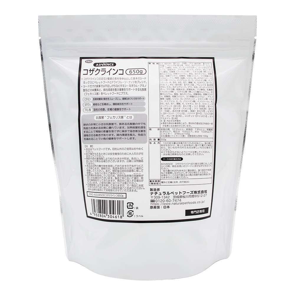 基本のシードミックスとペレットフード、フルーツ・ナッツをブレンド。飽きのこないおいしさと栄養価を追求したコザクラインコのための総合栄養食。 腸内環境を整え健康をサポートする乳酸菌(フェカリス菌)をペレットフードにプラス。鮮度を保つアルミパックを採用。※専門店様専用