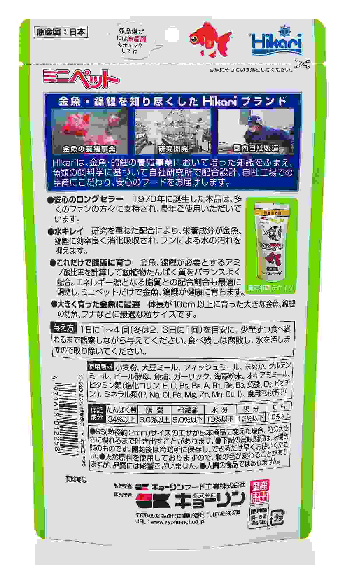 小麦粉、大豆ミール、フィッシュミール、米ぬか、グルテンミール、ビール酵母、魚油、ガーリック、海藻粉末、オキアミミール、ビタミン類(塩化コリン、E、C、B5、B2、A、B1、B6、B3、葉酸、D3、ビオチン)、ミネラル類(P、Na、Cl、Fe、Mg、Zn、Mn、Cu、I)、食用色素(青2)