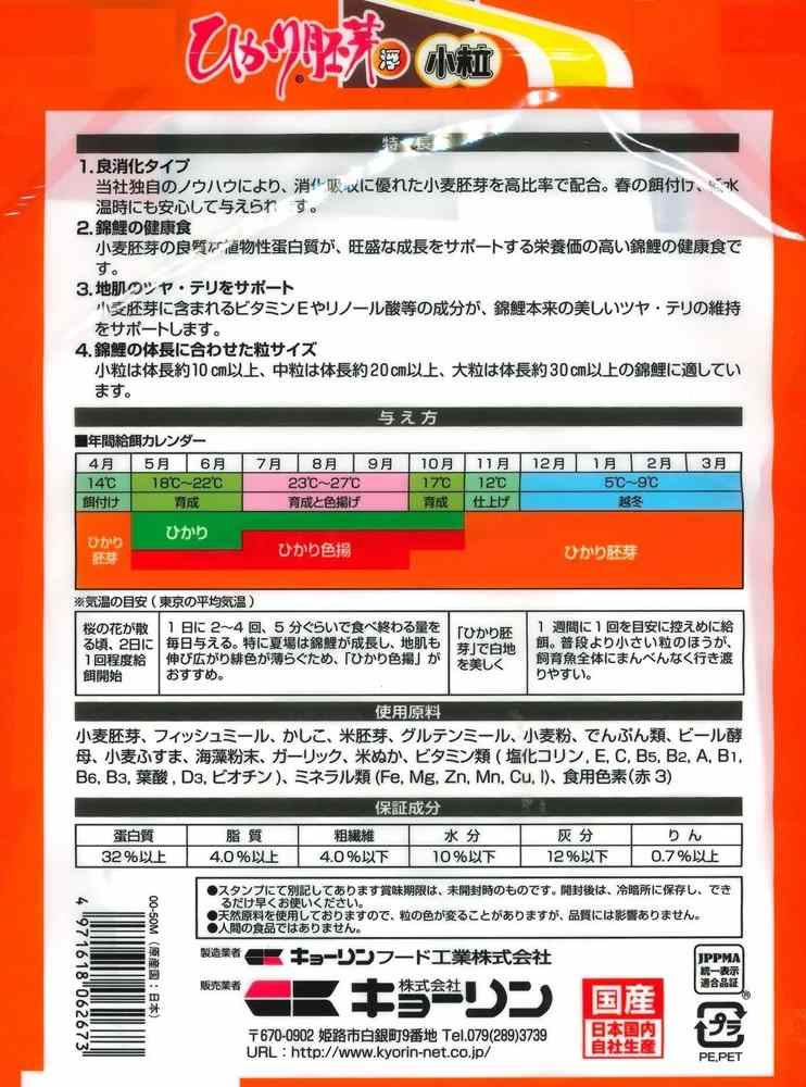 消化に優れた小麦胚芽を高配合し、ビタミンEとリノール酸が魚の体を酸化から守り、抵抗力を維持します。