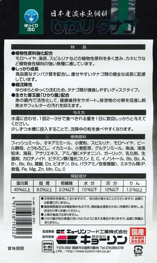 植物性原料強化配合、タナゴ類の健全な成長に配慮します。
