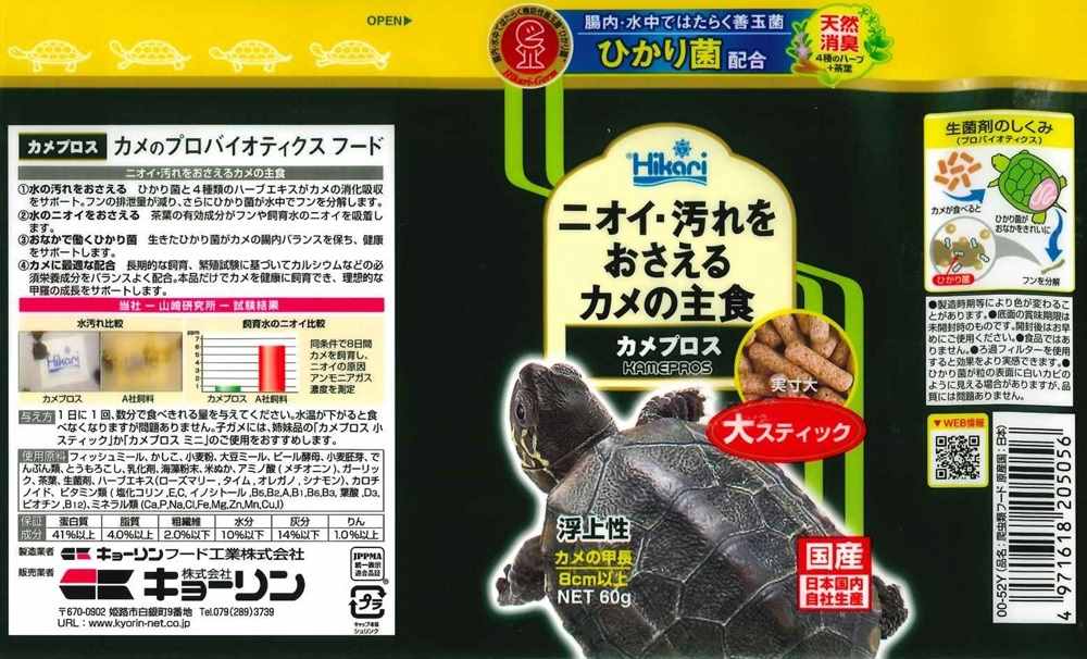カメの健康と水質維持に最適な水棲カメ専用飼料です。