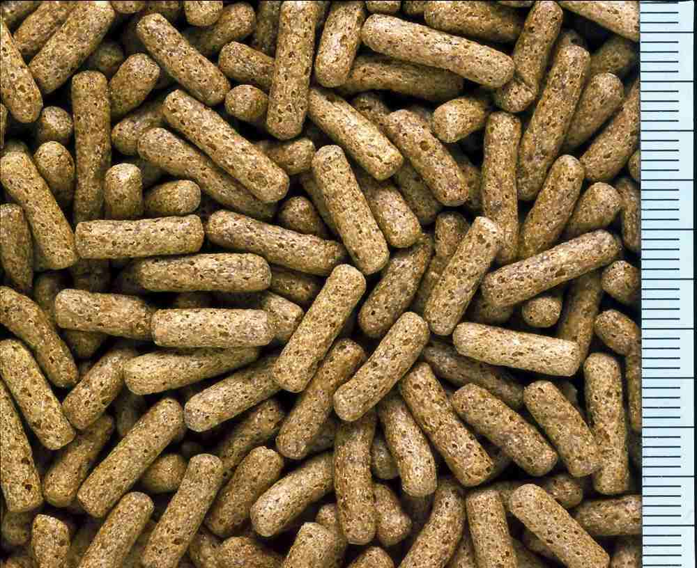 フィッシュミール、小麦粉、かしこ、大豆ミール、ビール酵母、小麦胚芽、とうもろこし、乳化剤、海藻粉末、米ぬか、アミノ酸(メチオニン)、ハーブエキス(ローズマリー、タイム、オレガノ、シナモン)、ガーリック、茶葉、生菌剤、カロチノイド、ビタミン類(塩化コリン、E、C、イノシトール、B5、B2、A、B1、B6、B3、K、葉酸、D3、ビオチン)、ミネラル類(P、Ca、Fe、Mg、Zn、Mn、Co、Cu、I、Se)