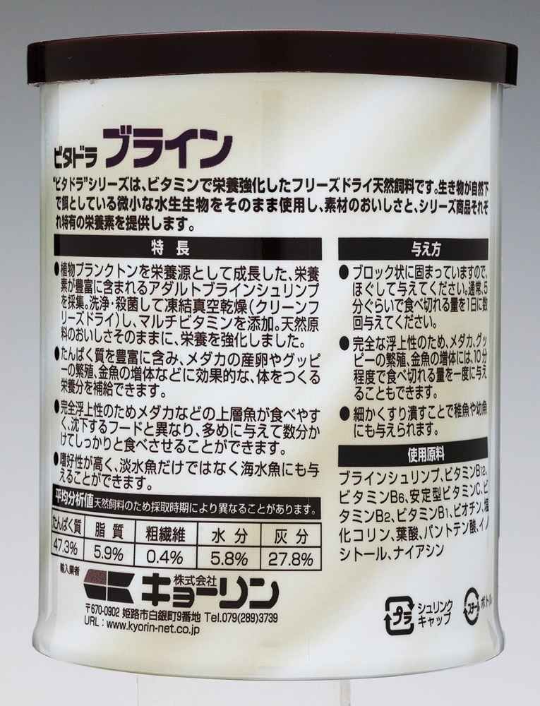 ブラインシュリンプ、ビタミンB12、ビタミンB6、安定型ビタミンC、ビタミンB2、ビタミンB1、ビオチン、塩化コリン、葉酸、パントテン酸、イノシトール、ナイアシン