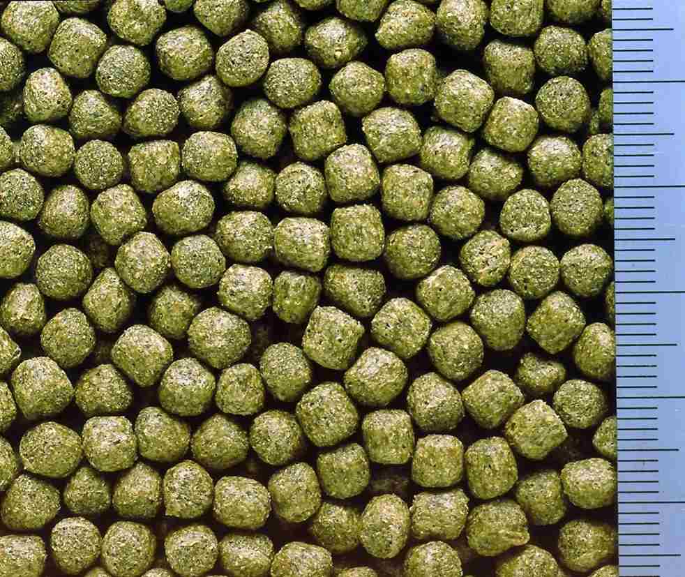 フィッシュミール、小麦粉、糟糠類、大豆粕、グルテンミール、濃縮アルファルファ、シルクワームミール、ワカメ、ビール酵母、魚油、ビタミン類(A、 D3、 E、 K、 塩化コリン、 C、 B5、 B2、 B1、 B6、 B3、 葉酸、 ビオチン)、ミネラル類(Fe、 Mg、 Zn、 Mn、 Co、 Cu、 I、 Se、 P)