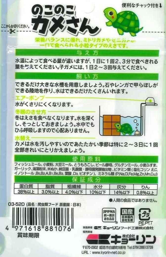 栄養バランスに優れ、小型のゼニガメなど水棲カメが一口で食べられる浮上性の小粒タイプのエサです。