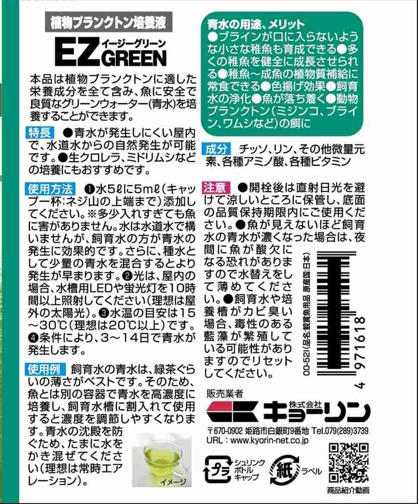観賞魚に安全で良質なグリーンウォーター(青水)を培養することができる、植物プランクトン培養液です。