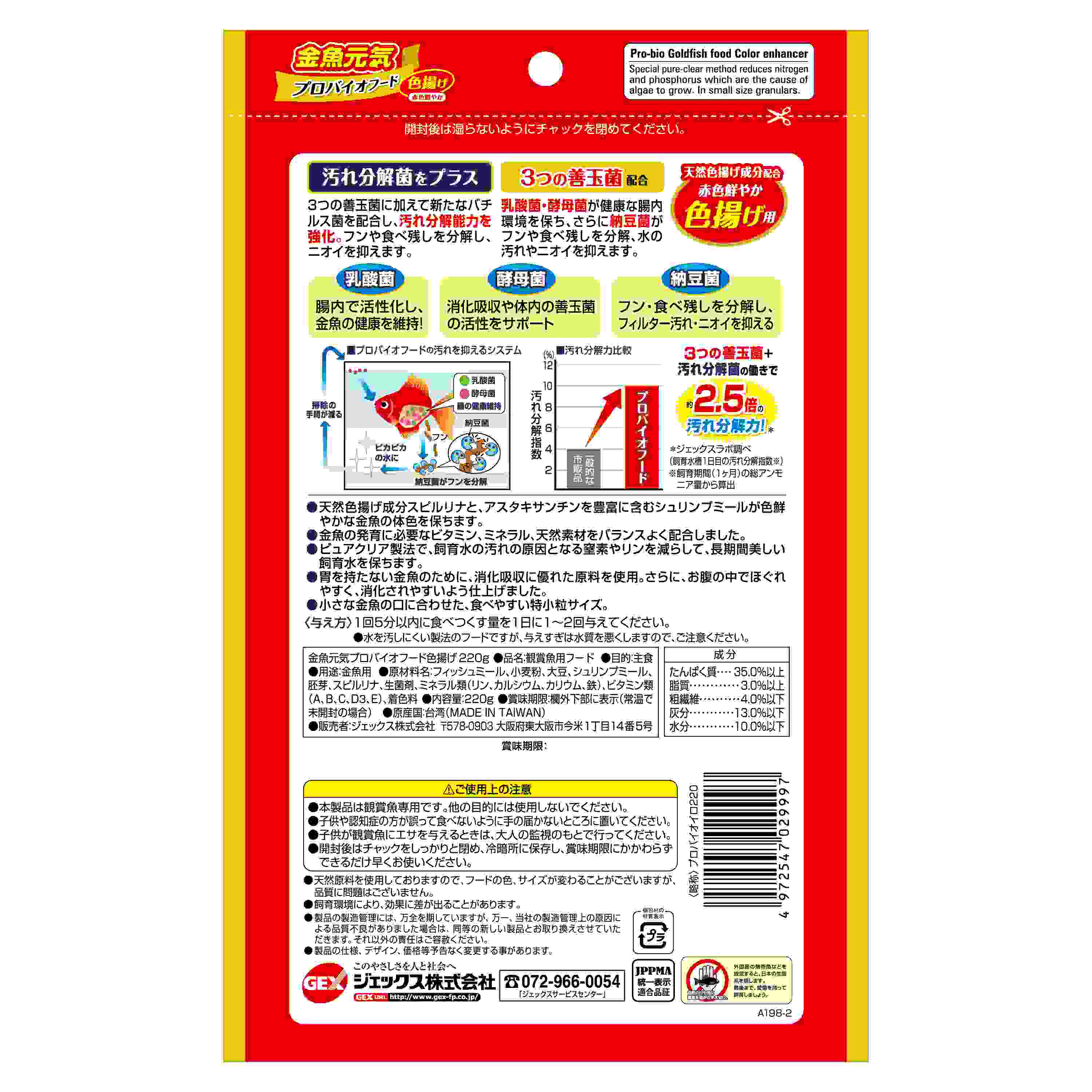 金魚のフンを分解ニオイを抑える。赤色鮮やか色揚げ天然色揚げ成分配合3つの善玉菌配合。たくさん食べても水を汚さない!