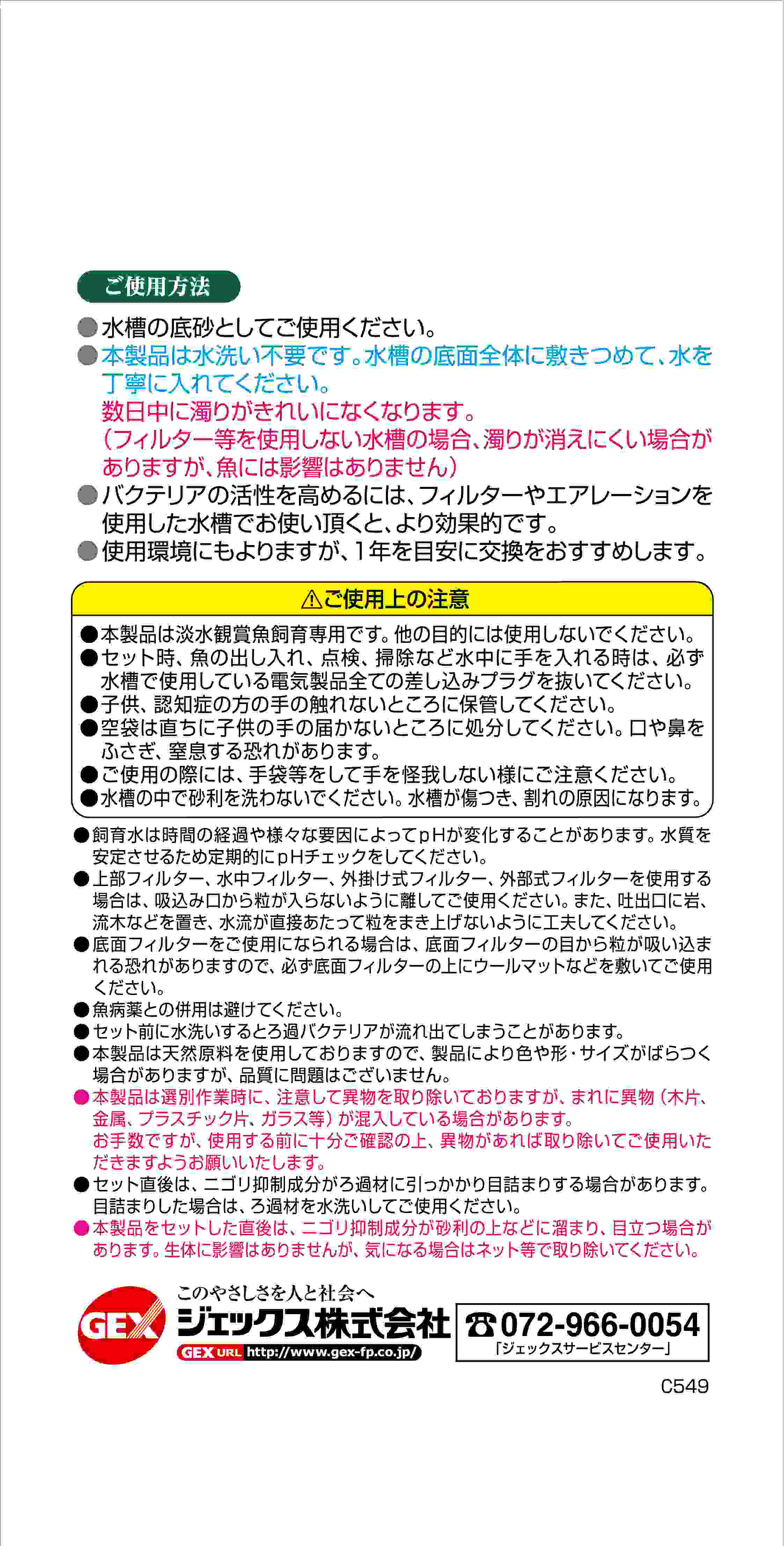 ・飼育水は時間の経過や様々な要因によってpHが変化します。水質を安定させるため定期的にpHチェックをしてください。・水換えの際にはソイルをできるだけ丁寧に取扱いください。・上部フィルター、水中フィルター、外掛け式フィルター外部式フィルターを使用する場合は、吸い込み口から砂が入らないように離してご使用ください。また吐出口に岩、流木などを置き、水流が直接砂にあたって、砂を巻き上げないように工夫してください。・セット前に水洗いするとろ過バクテリアが流れ出てしまうことがあります。
