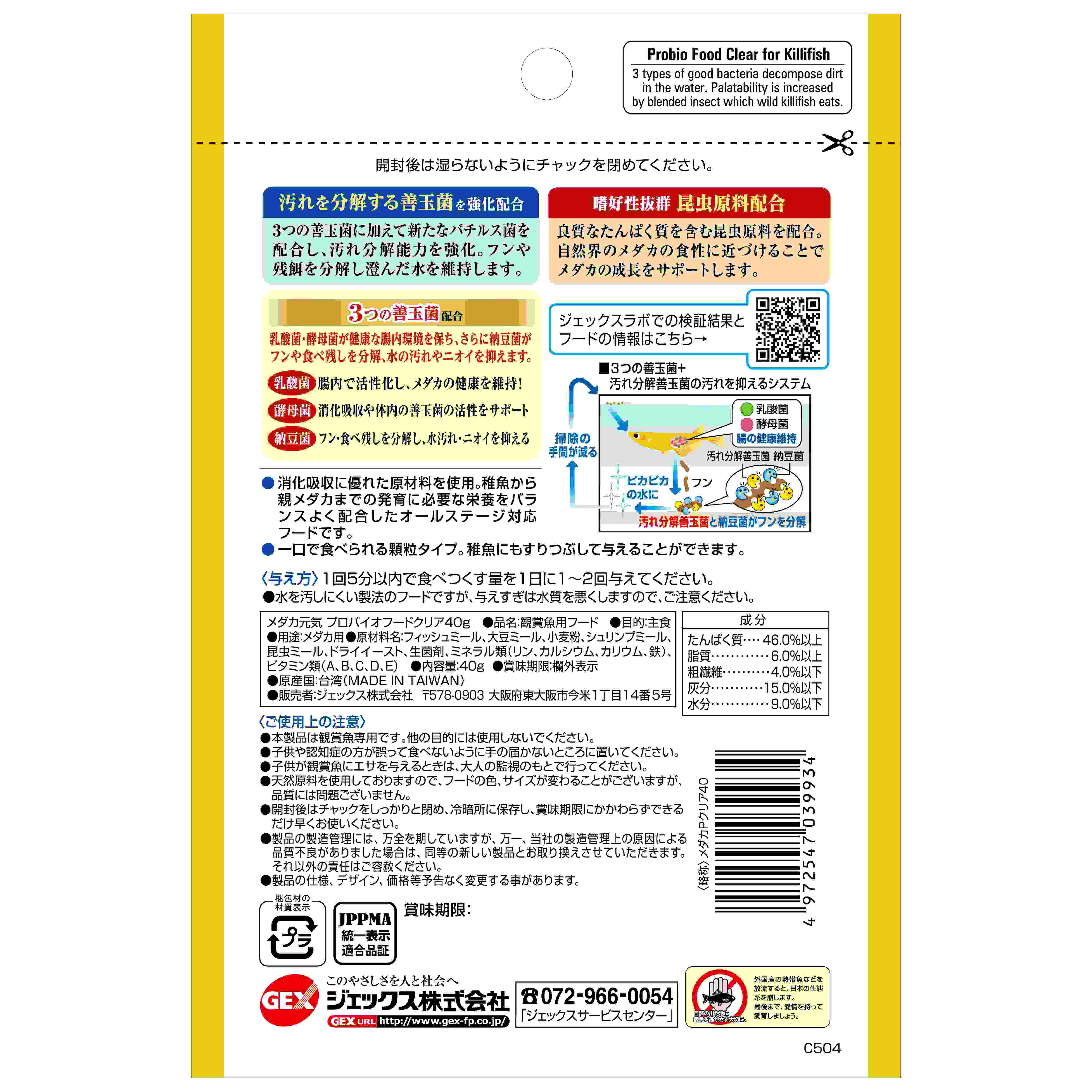 ●汚れを分解する善玉菌を強化配合。●3つの善玉菌に加えて新たなバチルス菌を配合し、汚れ分解能力を強化。フンや残餌を分解し澄んだ水を維持します。●嗜好性抜群で良質なたんぱく質を含む昆虫原料を配合。●自然界のメダカの食性に近づけることでメダカの成長をサポートします。●消化吸収に優れた原材料を使用。稚魚から親メダカまでの発育に必要な栄養をバランスよく配合したオールステージ対応フードです。●一口で食べられる顆粒タイプ。稚魚にもすりつぶして与えることができます。