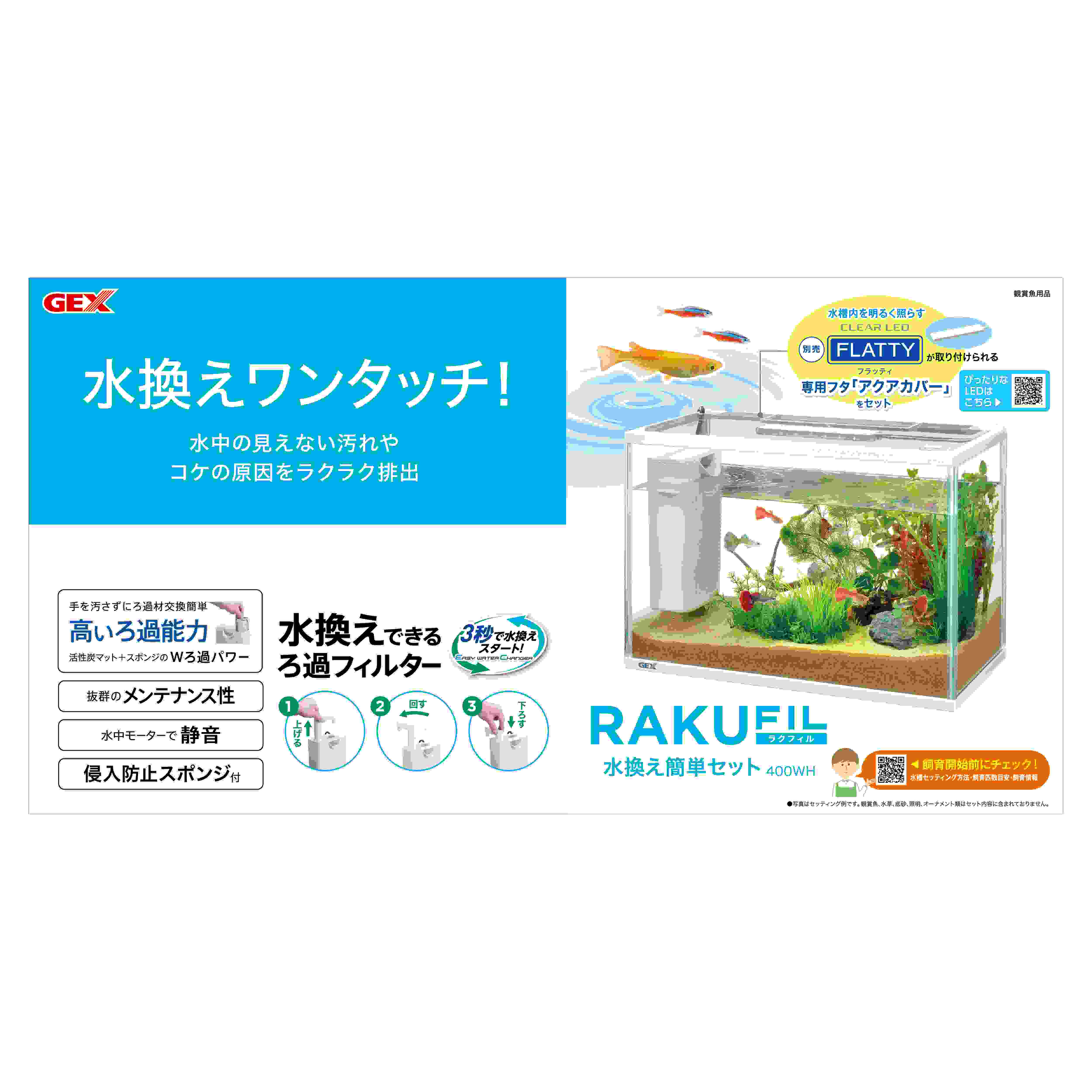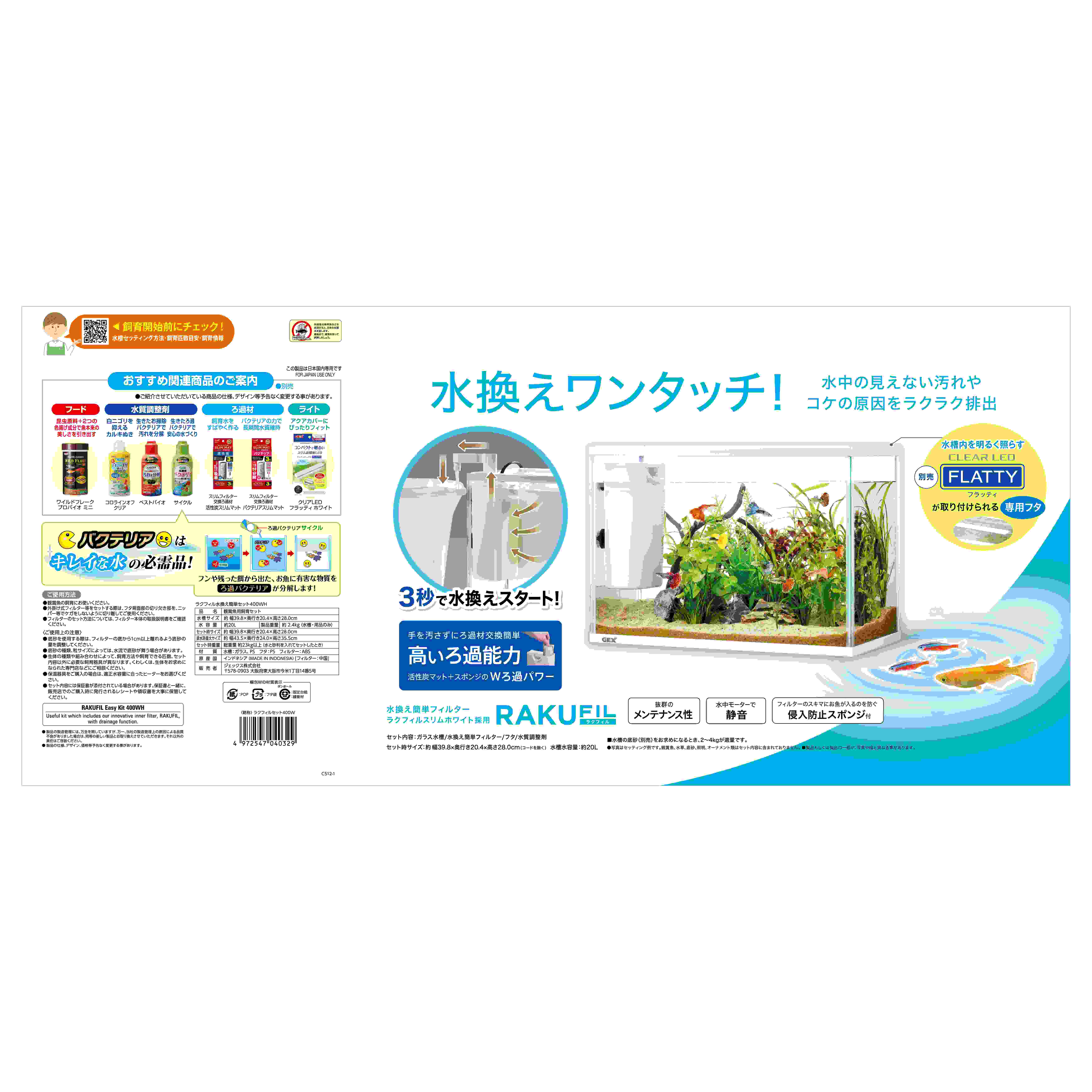 ●水換え簡単フィルター採用 水換えを楽しく簡単に●お部屋のインテリアに合わせやすいホワイトフレーム●水換えできるろ過フィルター ラクフィルスリムホワイトをセット●3秒で水換えスタート!●高いろ過能力 活性炭マット+スポンジのWろ過パワー●抜群のメンテナンス性●水中モーターで静音