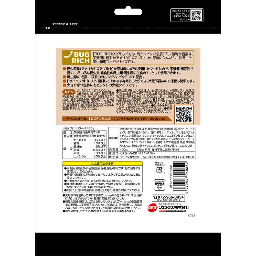 「BUG RICH(バグリッチ)」は、高タンパクで必須アミノ酸等が豊富な、栄養価に優れたアメリカミズアブ幼虫を、原料にふんだんに使用した爬虫類用フードシリーズです。●昆虫原料(アメリカミズアブ幼虫)を原材料中47%使用したフードなので、栄養価・嗜好性が高く、いろいろな昆虫食・雑食性の爬虫類・両生類の主食の1つとして使用できます。●爬虫類の成長に必須のカルシウム・ビタミンD3配合。●ドライペレットなので、開封してそのまま与えることができ、冷蔵不要なので保管も簡単です。●大きく育つ生体にもピッタリの大粒タイプです。