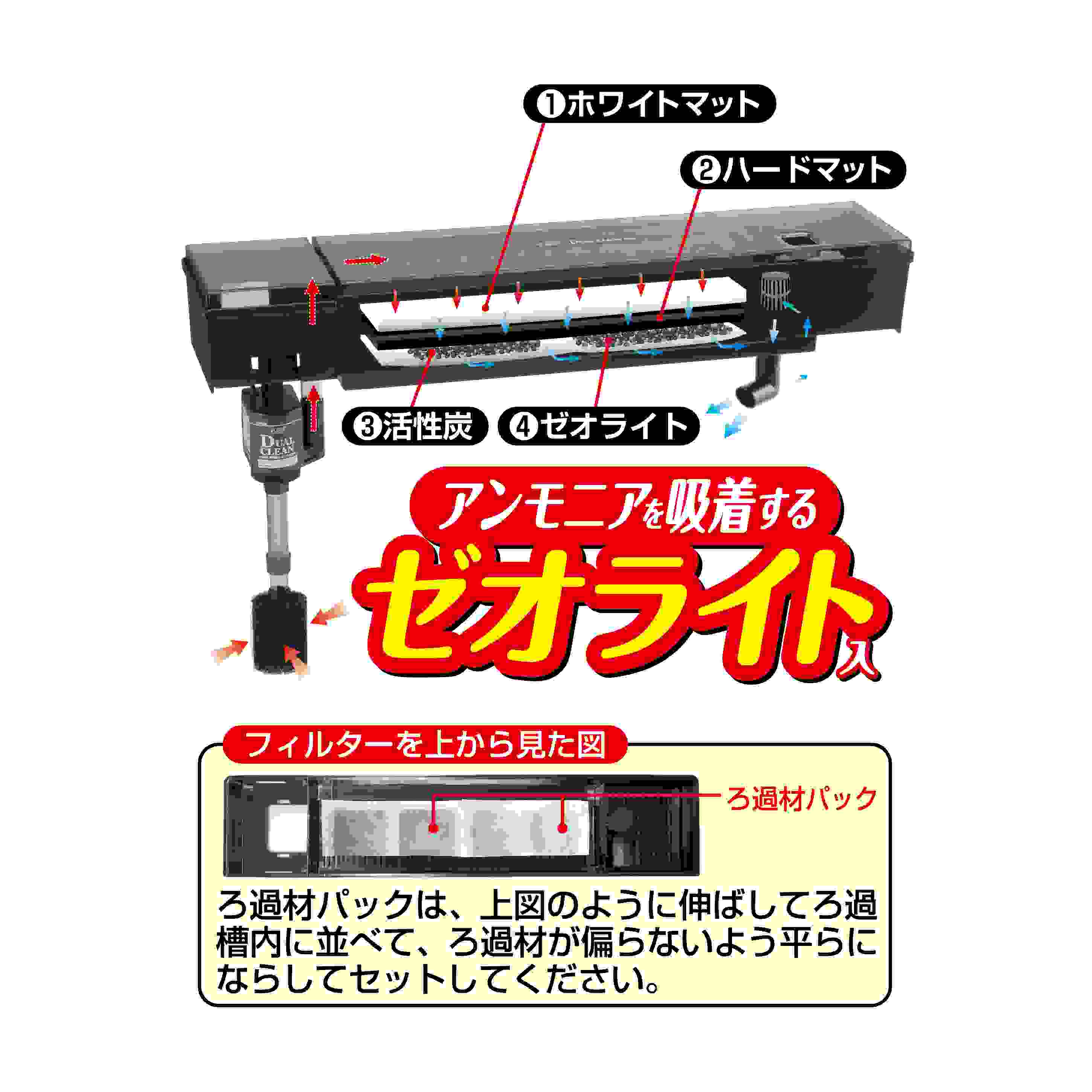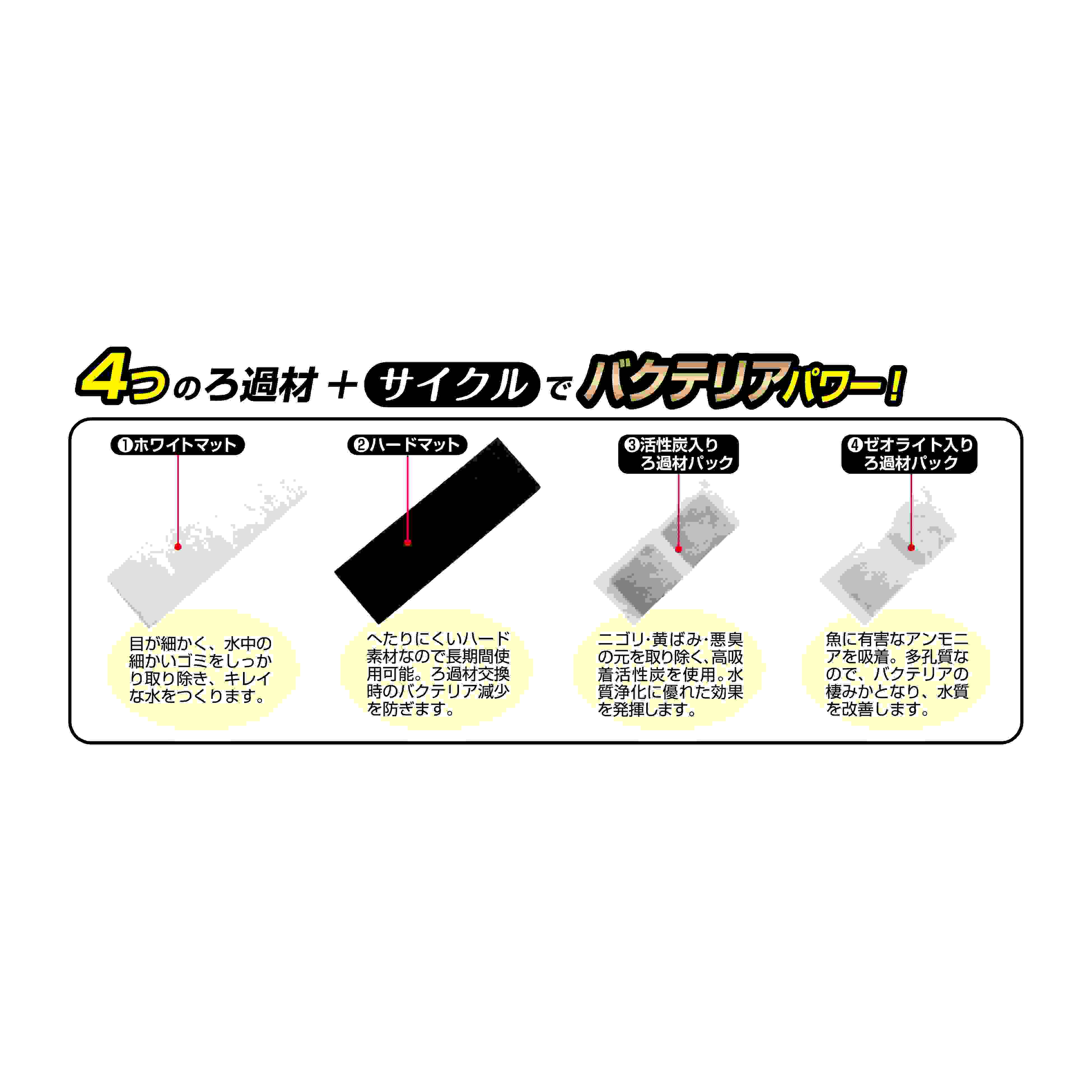 ●各社共通タイプ●バクテリアパワー!もっと水キレイ!●アンモニアを吸着するゼオライト入●4つのろ過材+生きたろ過バクテリア「サイクル」1回分付