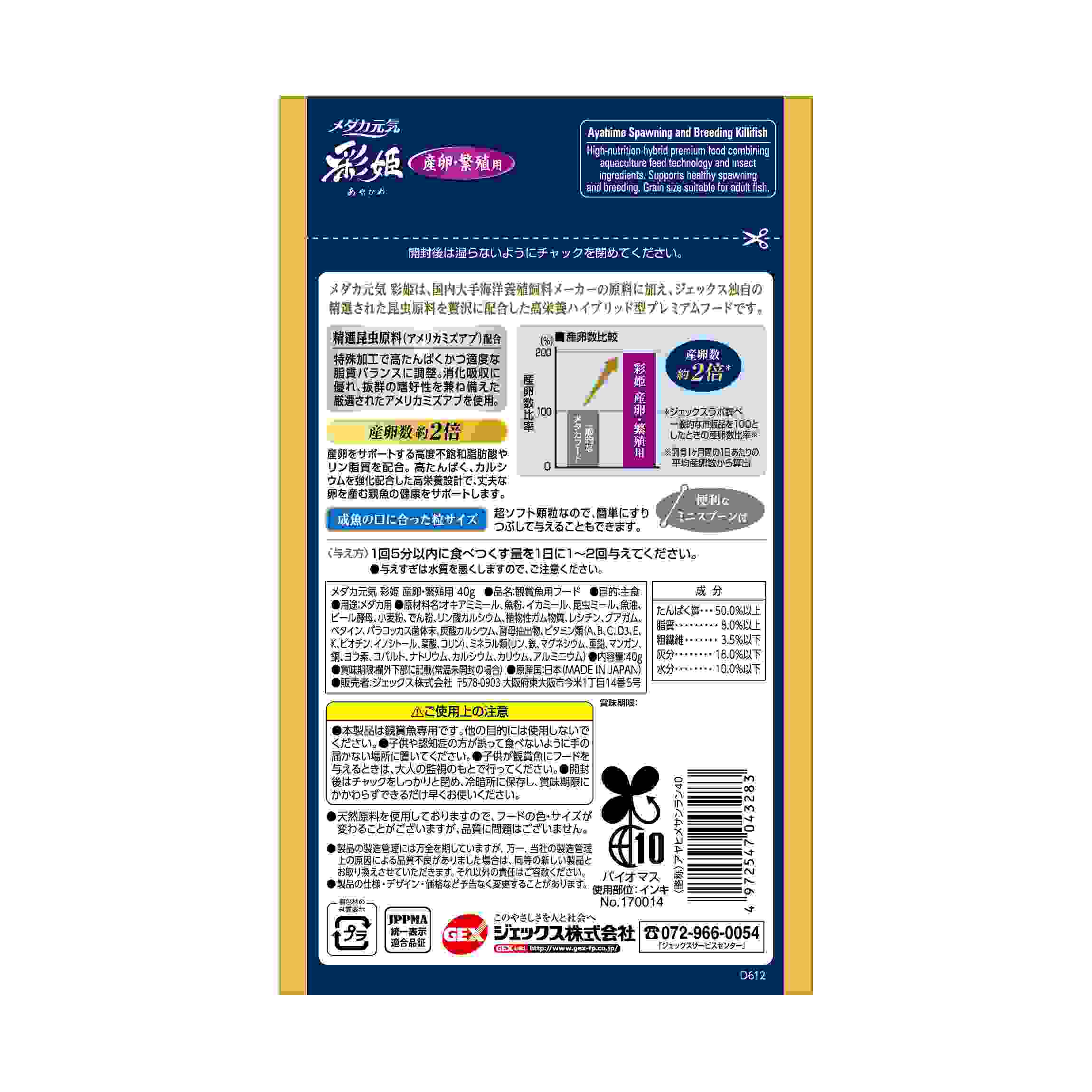 ●メダカ元気 彩姫は、国内大手海洋養殖飼料メーカーの原料に加え、ジェックス独自の精選された昆虫原料を贅沢に配合した高栄養ハイブリッド型プレミアムフードです。●精選昆虫原料(アメリカミズアブ)配合 特殊加工で高たんぱくかつ適度な脂質バランスに調整。消化吸収に優れ、抜群の嗜好性を兼ね備えた厳選されたアメリカミズアブを使用。●産卵数約2倍 産卵をサポートする高度不飽和脂肪酸やリン脂質を配合。高たんぱく、カルシウムを強化配合した高栄養設計で、丈夫な卵を産む親魚の健康をサポートします。●成魚の口に合った粒サイズ 超ソフト顆粒なので、簡単にすりつぶして与えることもできます。便利なミニスプーン付
