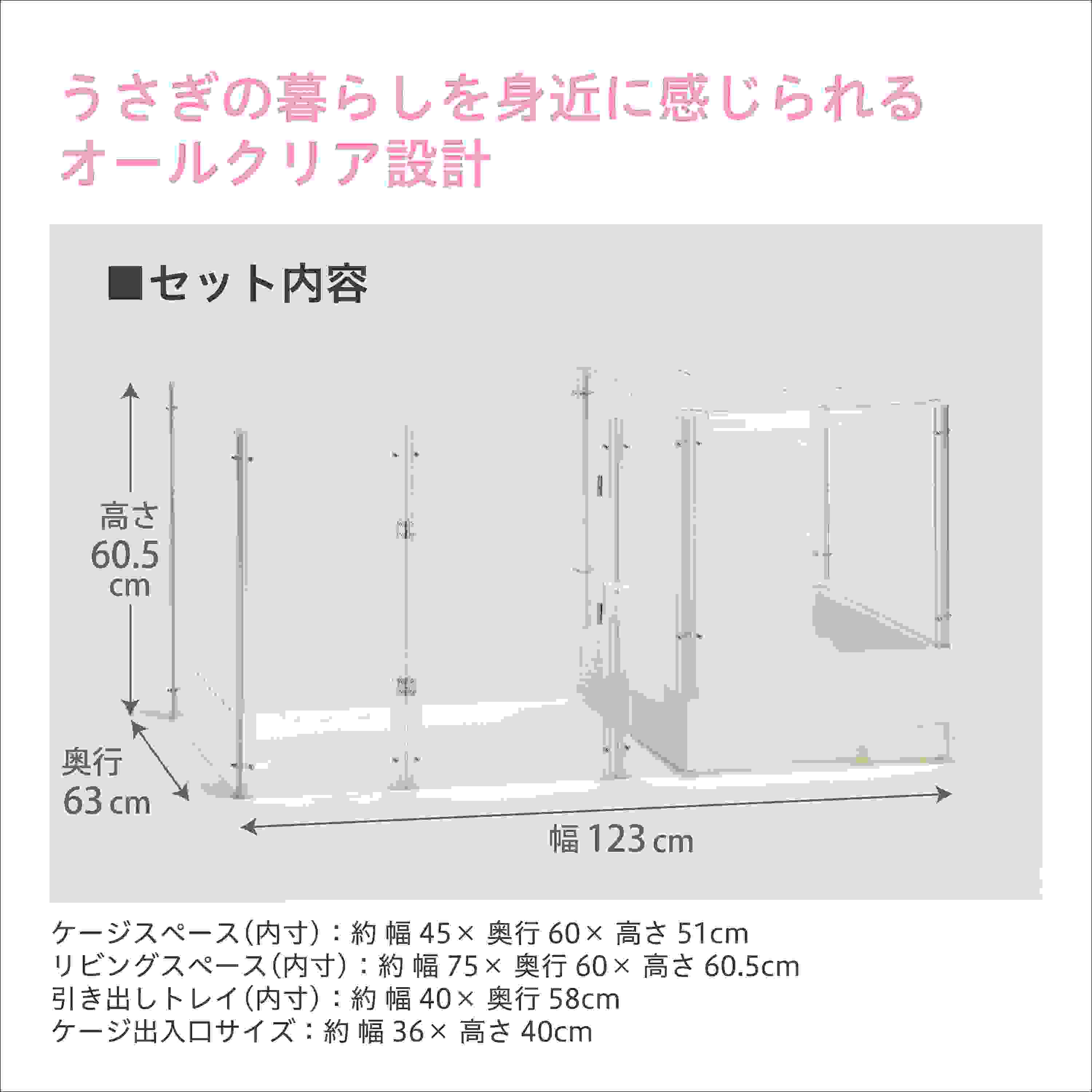 ●クリアでかわいい姿がよく見える●屋根付きケージスペースで外出時も安心●引き出しトレイでお世話が簡単●ケージスペースは左右どちらにも設置可能●拡張セット(別売)でもっとひろびろ●リビングスペース用 飛び出し防止ネット&爪がひっかからないマット付