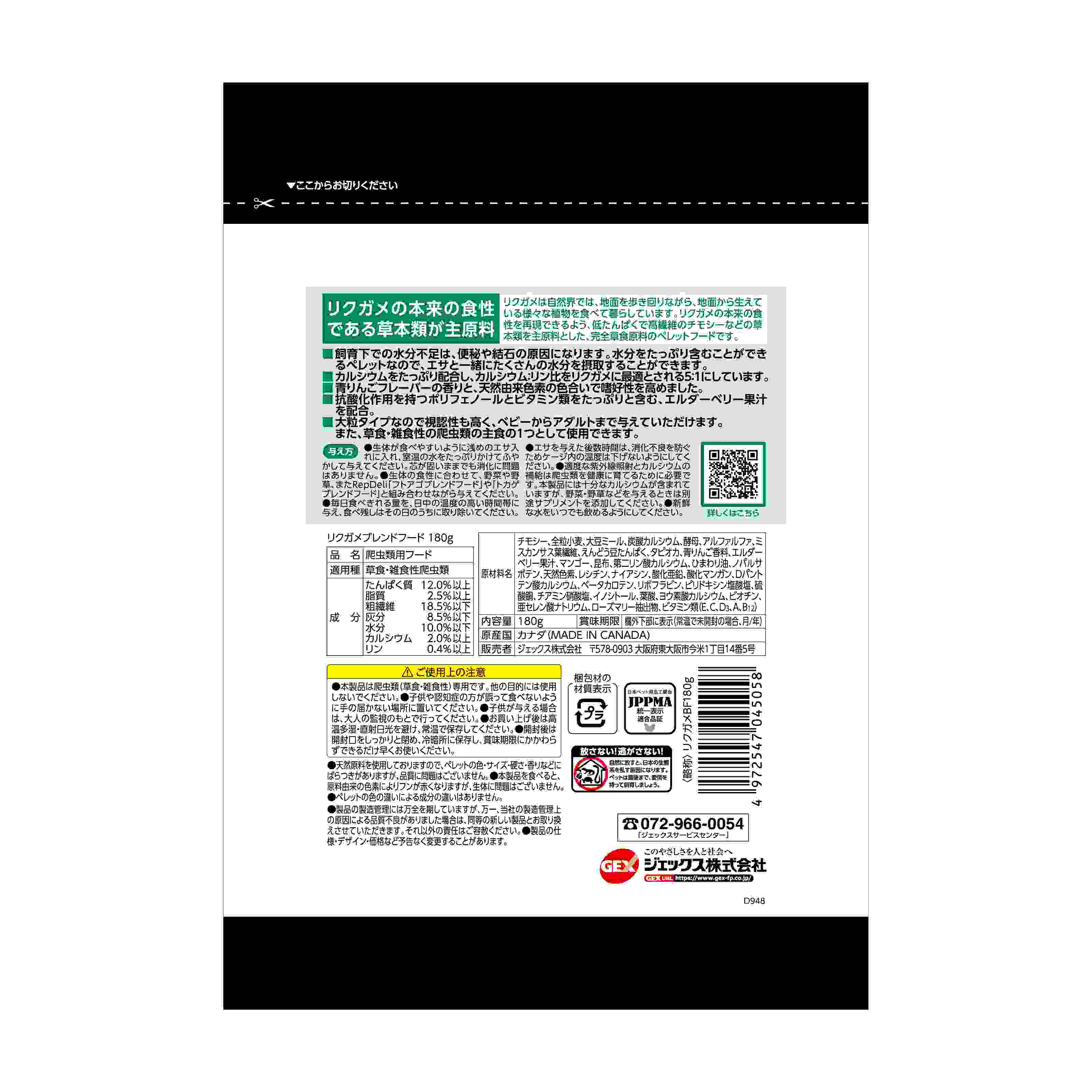 ●リクガメの本来の食性である草本類が主原料:リクガメは自然界では、地面を歩き回りながら、地面から生えている様々な植物を食べて暮らしています。リクガメの本来の食性を再現できるよう、低たんぱくで高繊維のチモシーなどの草本類を主原料とした、完全草食原料のペレットフードです。●飼育下での水分不足は、便秘や結石の原因になります。水分をたっぷり含むことができるペレットなので、エサと一緒にたくさんの水分を摂取することができます。●カルシウムをたっぷり配合し、カルシウム:リン比をリクガメに最適とされる5:1にしています。●青りんごフレーバーの香りと、天然由来色素の色合いで嗜好性を高めました。