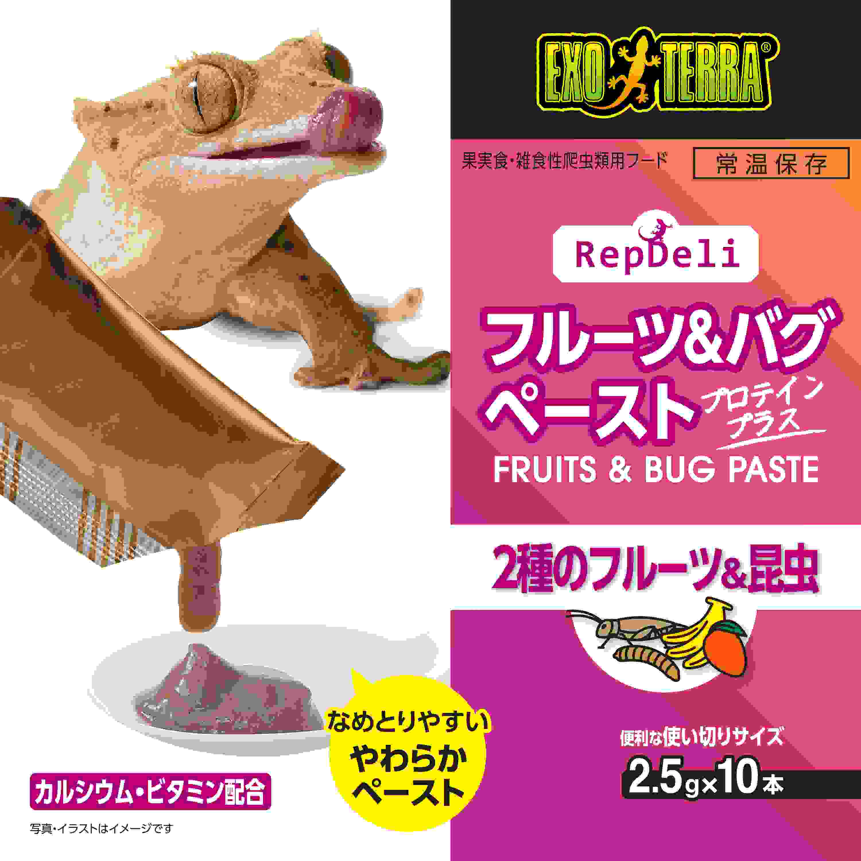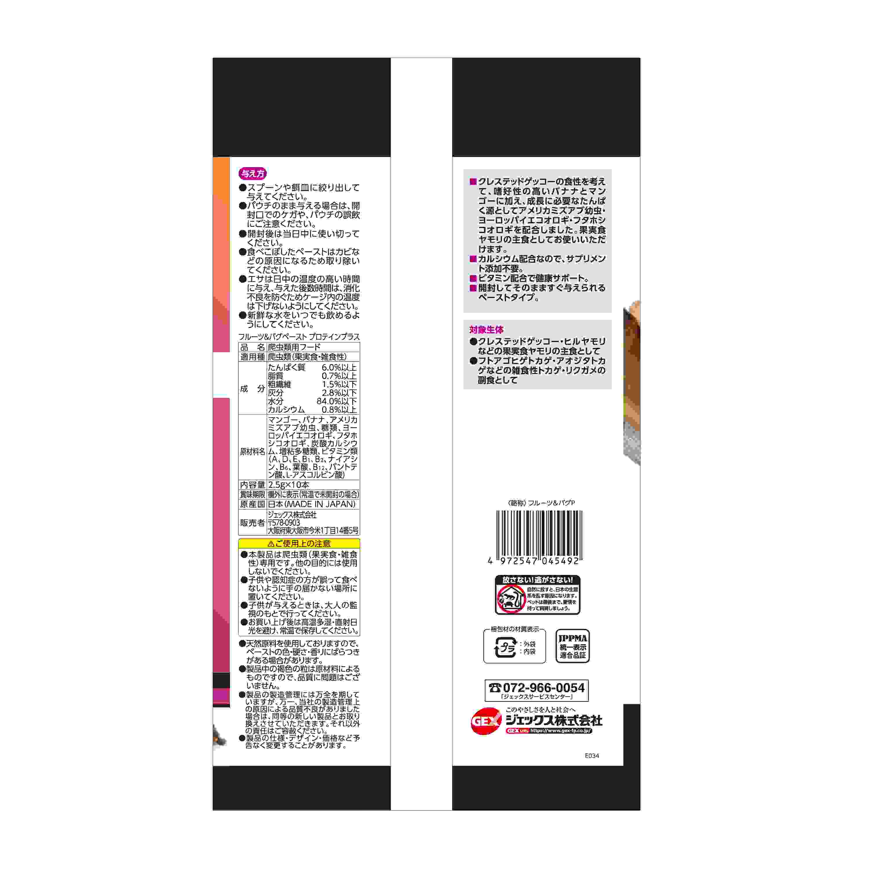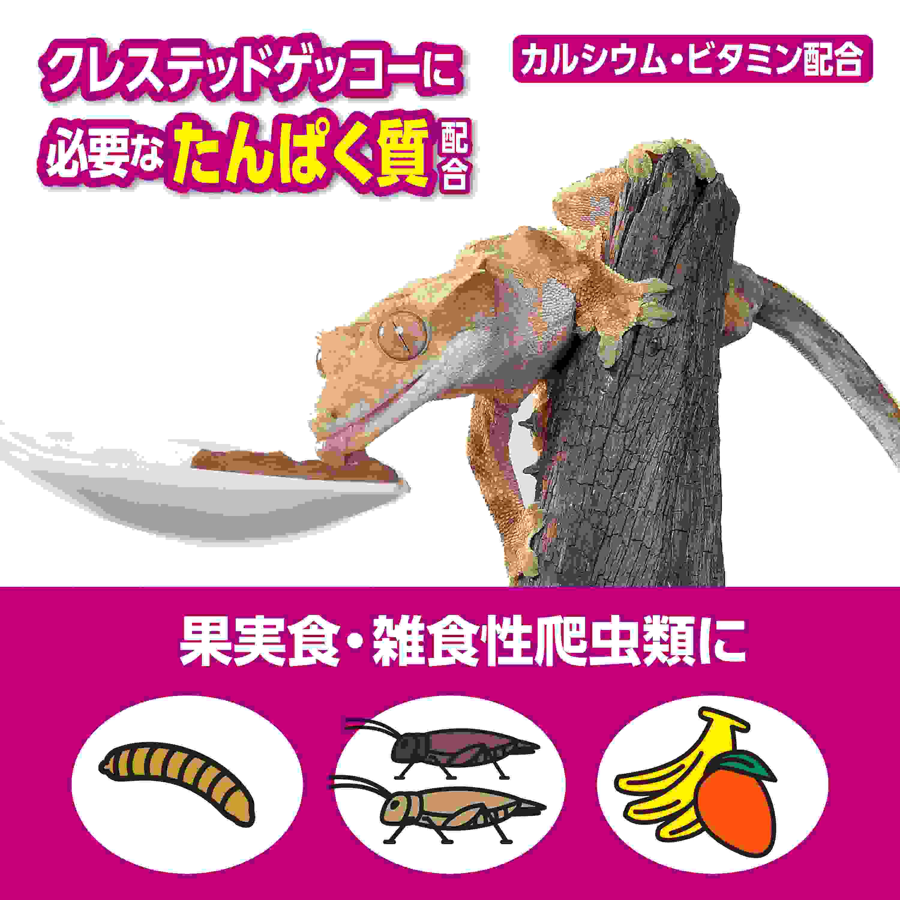 ●クレステッドゲッコーの食性を考えて、嗜好性の高いバナナとマンゴーに加え、成長に必要なたんぱく源としてアメリカミズアブ幼虫・ヨーロッパイエコオロギ・フタホシコオロギを配合しました。果実食ヤモリの主食としてお使いいただけます。●カルシウム配合なので、サプリメント添加不要。●ビタミン配合で健康サポート。●開封してそのまますぐ与えられるペーストタイプ。●対象生体:クレステッドゲッコー・ヒルヤモリなどの果実食ヤモリの主食として。フトアゴヒゲトカゲ・アオジタトカゲなどの雑食性トカゲ・リクガメの副食として。