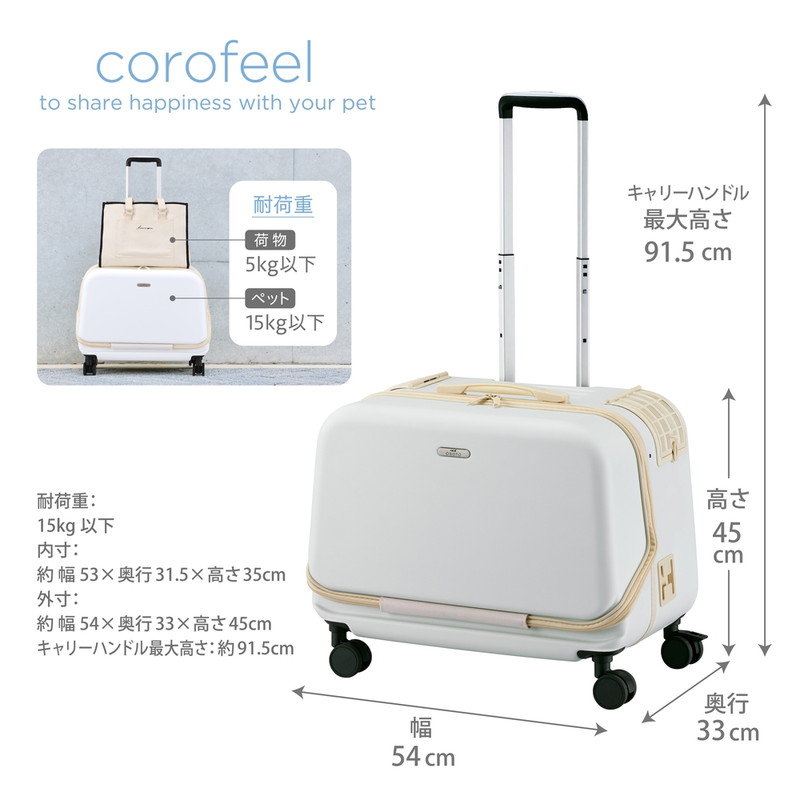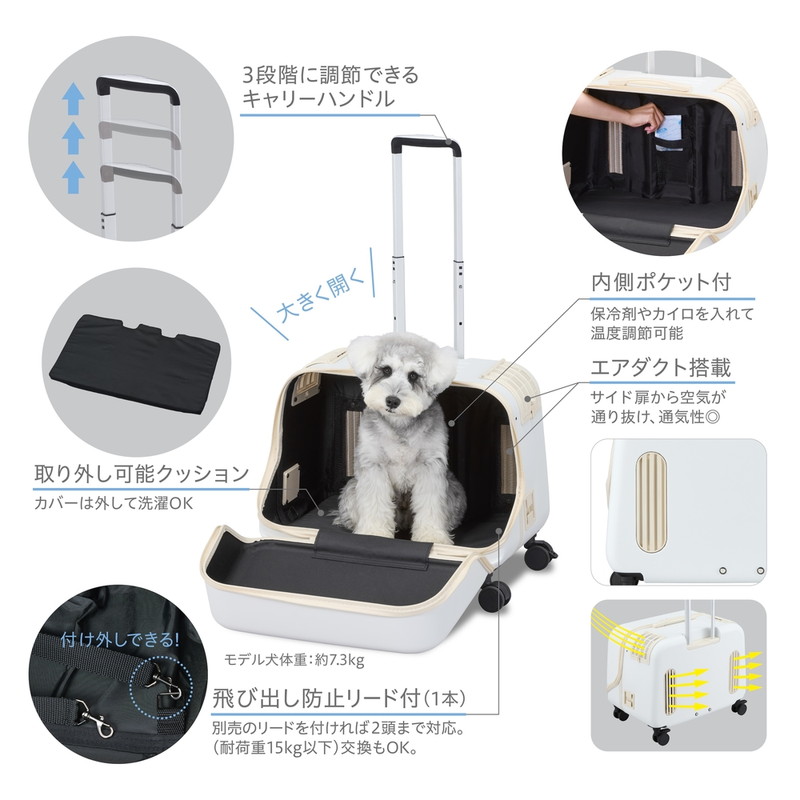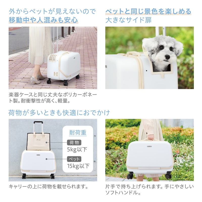 荷物が多い時でも快適にお出かけできます。 上に荷物を載せられ、片手で持ち上げられる手にやさしいソフトハンドルを装備。 エアダクト搭載しており、サイド扉から空気が通り抜け、通気性が抜群です。 大きなサイド扉付きなので、ペットと一緒に同じ景色を楽しむことができます。 サイド扉には扉ロック付き。 3段階に高さ調節が可能なキャリーハンドルを装備。 取り外し可能クッションが付属!カバーは外して洗濯可能。 内側ポケット付きで保冷剤やカイロを入れて温度調節も簡単です。 電車に持ち込み可能なサイズ。 ※交通機関によって持ち込み条件が異なりますので、各交通機関の条件をご確認の上、ご使用ください。
