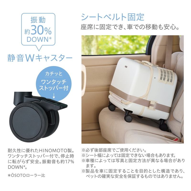 カチッとワンタッチストッパー付きで停止時も安全。 振動は約30%、振動音は約17%ダウン(OSOTOローラー比)。 シートベルトで座席に固定できるベルトガイド付きなので、車での移動にも。
