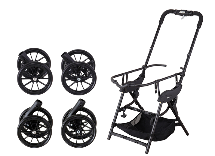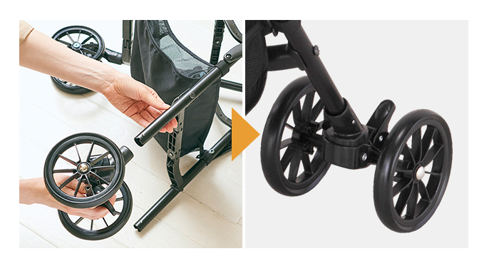 取り付けに工具は必要なく、タイヤに車体フレームを差し込むだけのワンタッチ。