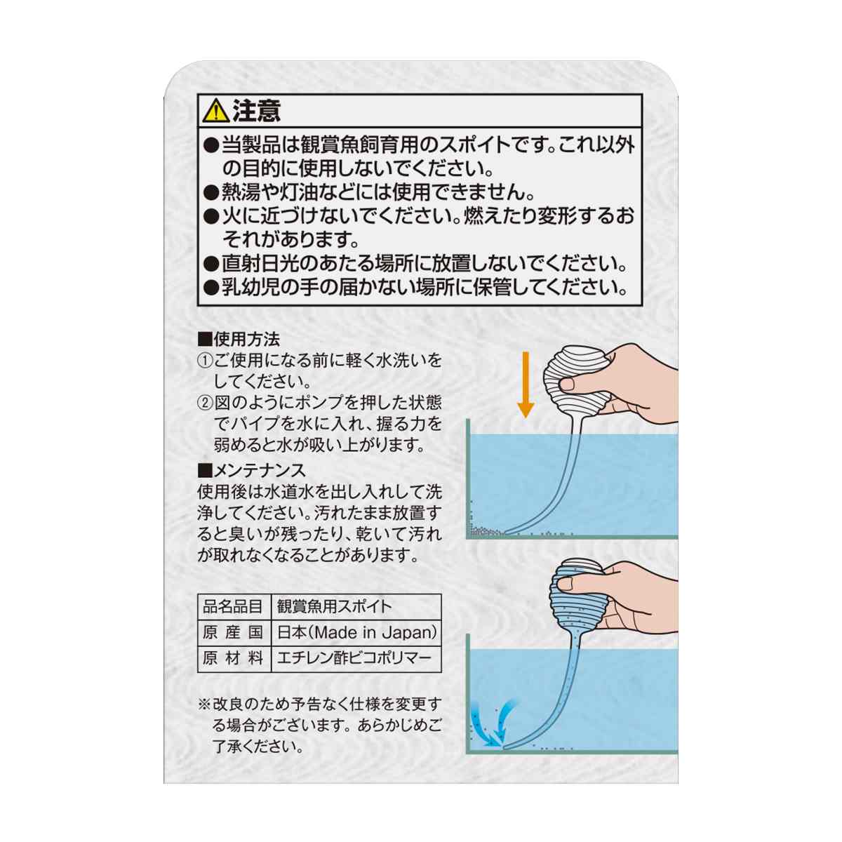 ●当製品は観賞魚飼育用のスポイトです。これ以外の目的に使用しないでください。●熱湯や灯油などには使用できません。●火に近づけないでください。燃えたり変形するおそれがあります。●直射日光のあたる場所に放置しないでください。●乳幼児の手の届かない場所に保管してください。