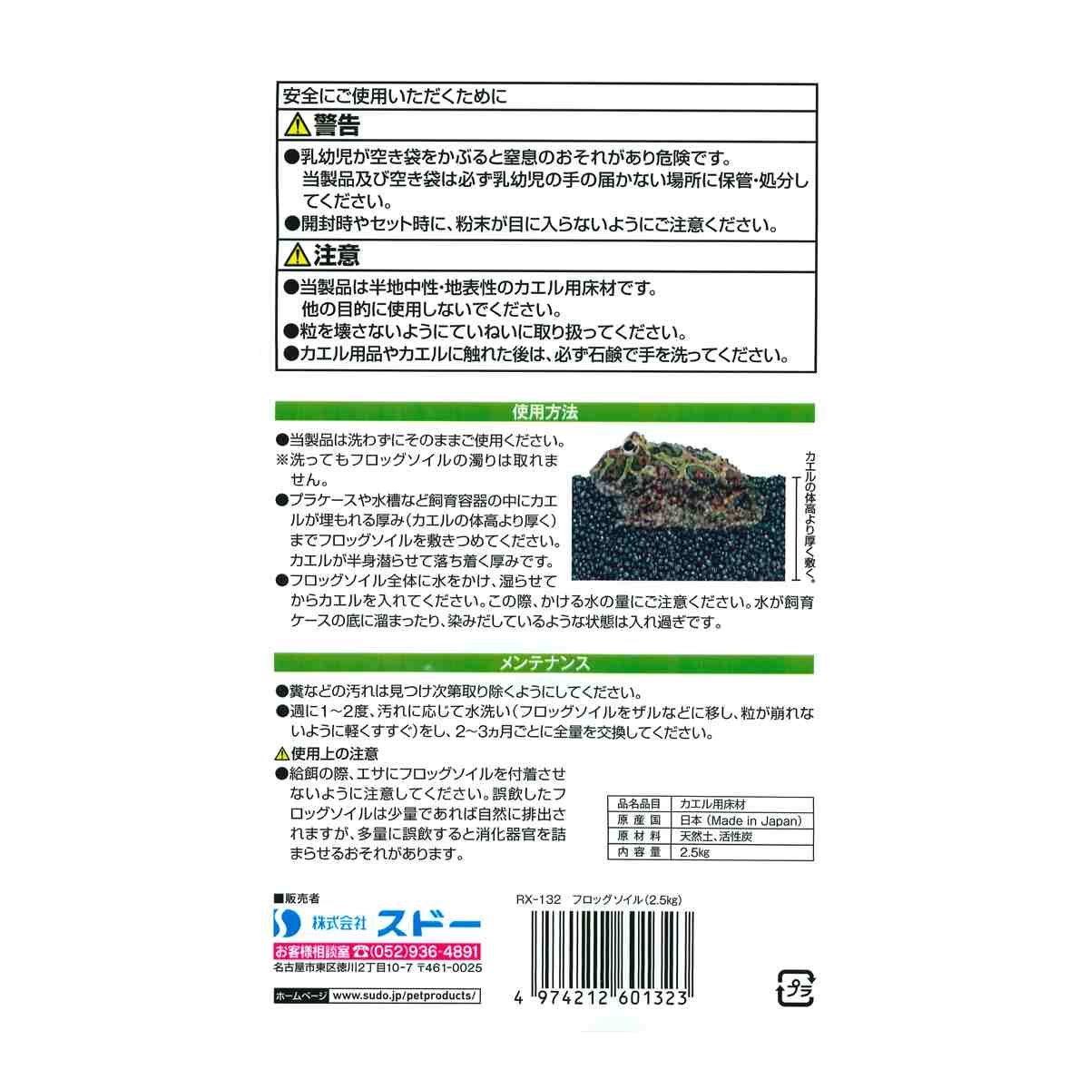 ●当製品は半地中性・地表性のカエル用床材です。他の目的に使用しないでください。●粒を壊さないようにていねいに取り扱ってください。●カエル用品やカエルに触れた後は、必す石鹸で手を洗ってください。