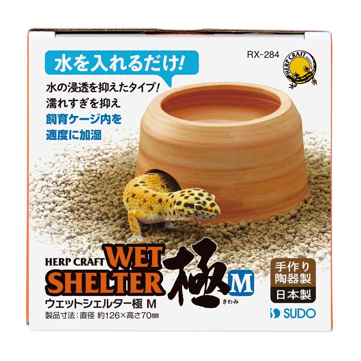 手作りならではの色合いと、心地よい肌触り!汚れを落としやすい表面仕上げのウェットシェルターです。シェルター上部に水を入れるだけで、飼育ケージ内を適度に加湿します。