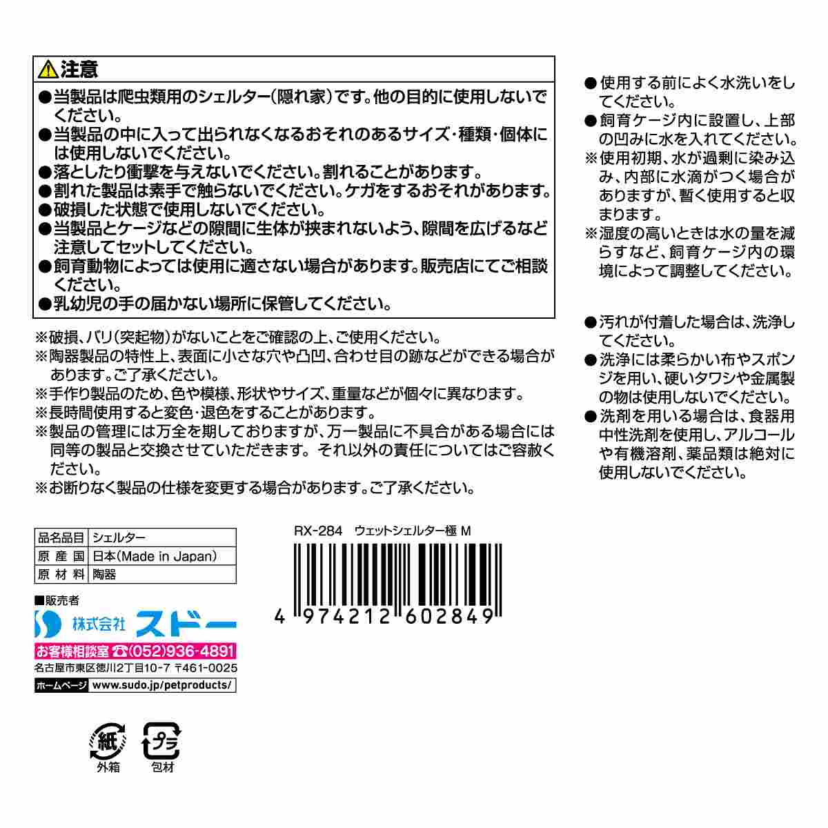 ●当製品は爬虫類用のシェルター(隠れ家)です。他の目的に使用しないでください。●当製品の中に入って出られなくなるおそれのあるサイズ・種類・個体には使用しないでください。●落としたり衝撃を与えないでください。割れることがあります。●割れた製品は素手で触らないでください。ケガをするおそれがあります。●破損した状態で使用しないでください。●当製品とケージなどの隙間に生体が挟まれないよう、隙間を広げるなど注意してセットしてください。●飼育動物によっては使用に適さない場合があります。販売店にてご相談ください。●乳幼児の手の届かない場所に保管してください。