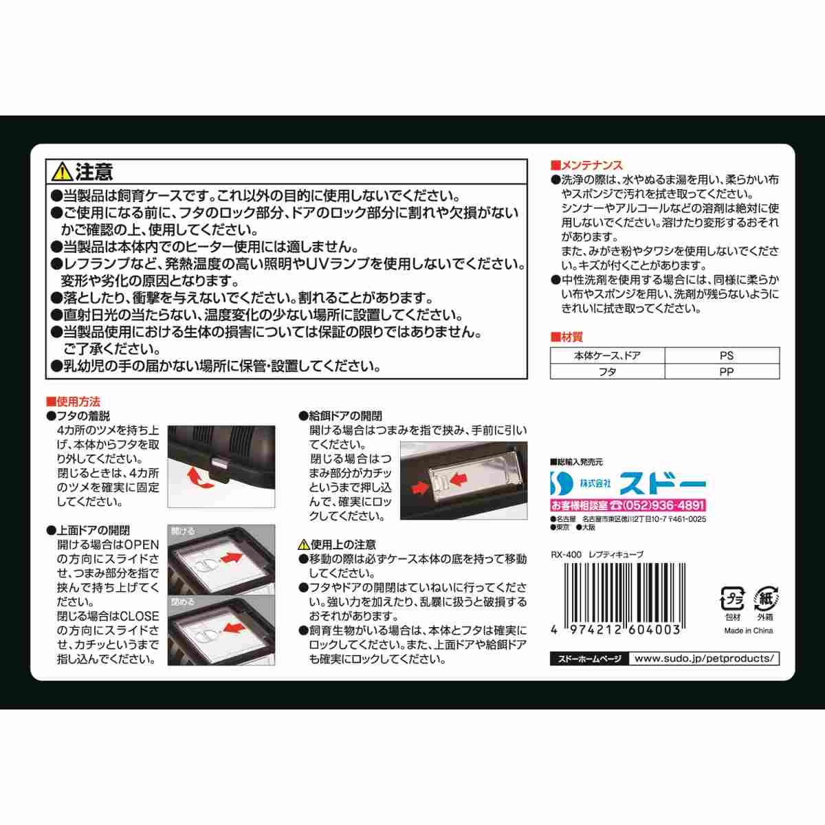 ●当製品は飼育ケースです。これ以外の目的に使用しないでください。●ご使用になる前に、フタのロック部分、ドアのロック部分に割れや欠損がないかご確認の上、使用してください。●当製品は本体内でのヒーターの使用には適しません。●レフランプなど、発熱量の高い保温器具・照明器具は使用しないでください。引火や変形、劣化の原因となります。●落としたり、強い衝撃を与えないでください。破損したり破片でケガをするおそれがあります。●直射日光の当たらない、温度変化の少ない場所に設置してください。●当製品使用における生体の損害については保証の限りではありません。ご了承ください。●乳幼児の手の届かない場所に保管・設置してください。