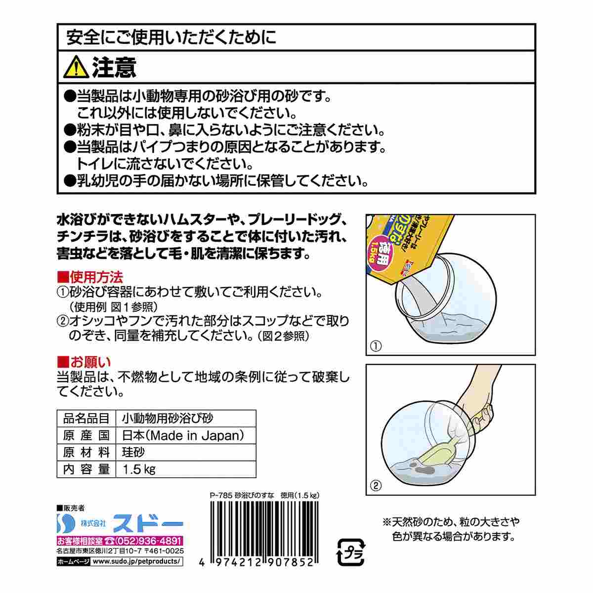 水浴びができないハムスターや、プレーリードッグ、チンチラは、砂浴びをすることで体に付いたノミやダニ、害虫などを落として毛・肌を清潔に保ちます。天然の珪砂を殺菌焼成した清潔な砂です。