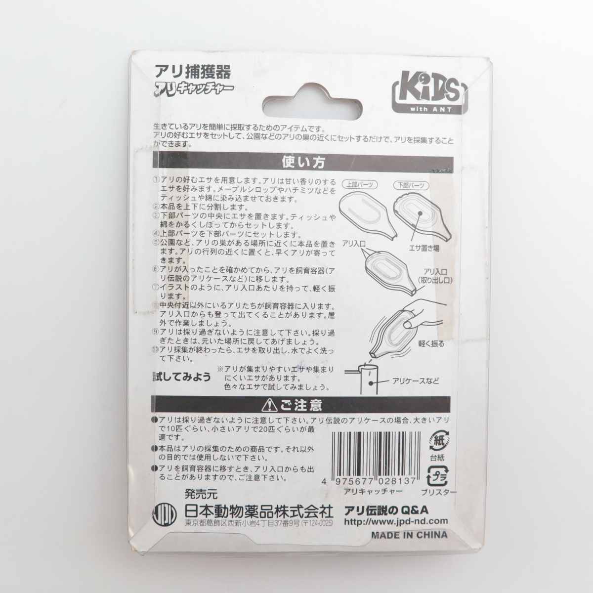 生きているアリを簡単に採取する為のアイテムです。アリの好むエサをセットして、公園などのアリの巣の近くにセットするだけで、アリを採集することができます。三次元アリの巣観察セット“アリ伝説”など、アリの巣を観察するときにお使い下さい。