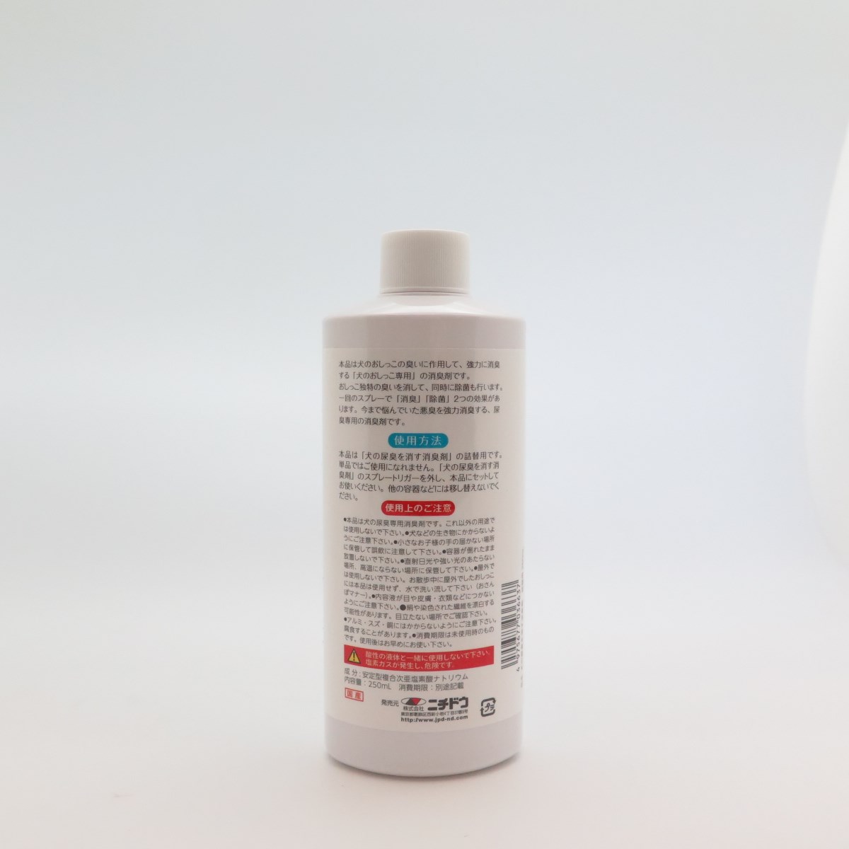 犬のおしっこの臭いに作用して、強力に消臭する「犬のおしっこ専用」の消臭剤です。おしっこ独特の臭いを消して、同時に除菌も行います。一回のスプレーで「消臭」「除菌」2つの効果があります。今まで悩んでいた悪臭を強力消臭する、尿臭専用の消臭剤です。