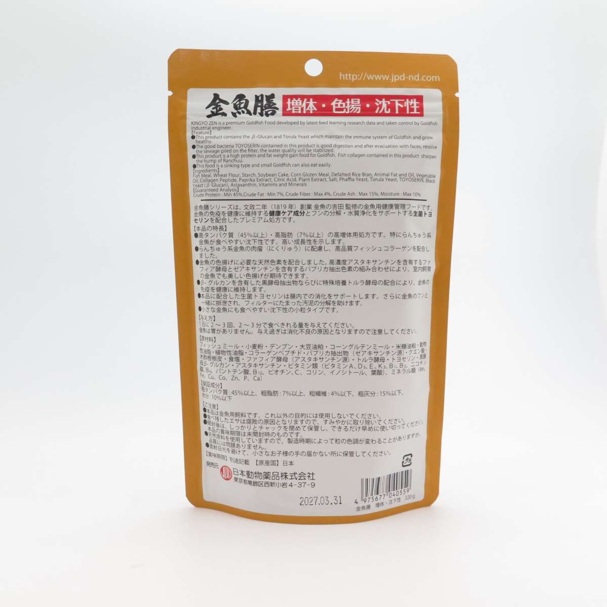●高タンパク質(45%以上)・高脂肪(7%以上)の高増体用処方です。特にらんちゅう系金魚が食べやすい沈下性です。高い成長性を示します。●らんちゅう系金魚の肉瘤(にくりゅう)に配慮し、高品質フィッシュコラーゲンを配合しました。●金魚の色揚げに必要な天然色素を配合しました。高濃度アスタキサンチンを含有するファフィア酵母とゼアキサンチンを含有するパプリカ抽出色素の組み合わせにより、室内飼育の金魚でも美しい色揚げが期待できます。●βーグルカンを含有した黒酵母抽出物ならびに特殊培養トルラ酵母の配合により、金魚の免疫を健康に維持します。●本品に配合した生菌トヨセリンは腸内での消化をサポートします。さらに金魚のフンと一緒に排泄され、フィルターにたまった汚泥の分解を助けます。●小さな金魚にも食べやすい沈下性の小粒タイプです。