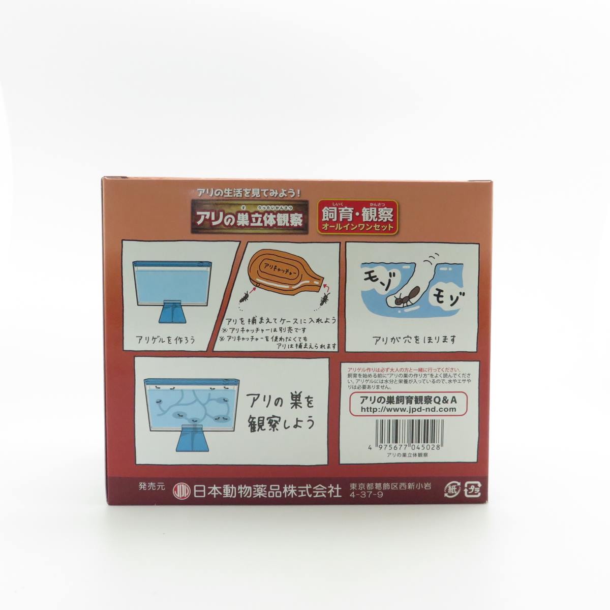 本品はアリの巣を立体的に観察できる飼育観察セットです。地中に巣穴を掘って生活するアリの生活や巣穴を掘っていく様子は今まで観察することができませんでした。本品はアリの巣穴の材料となる透明な「アリゲルの素」を使うことによって、その不思議なアリの生活を観察できるようになりました。「アリゲルの素」と水を合わせて電子レンジにかけることで、簡単に不思議なゲルが完成します。あとは、公園などでアリを採集し、容器に入れるだけで、アリたちが巣穴を掘りはじめます。アリゲルには水分と栄養が含まれているため、エサやりは必要ありません。立体的に広がっていくアリの巣の不思議な世界をお楽しみください。