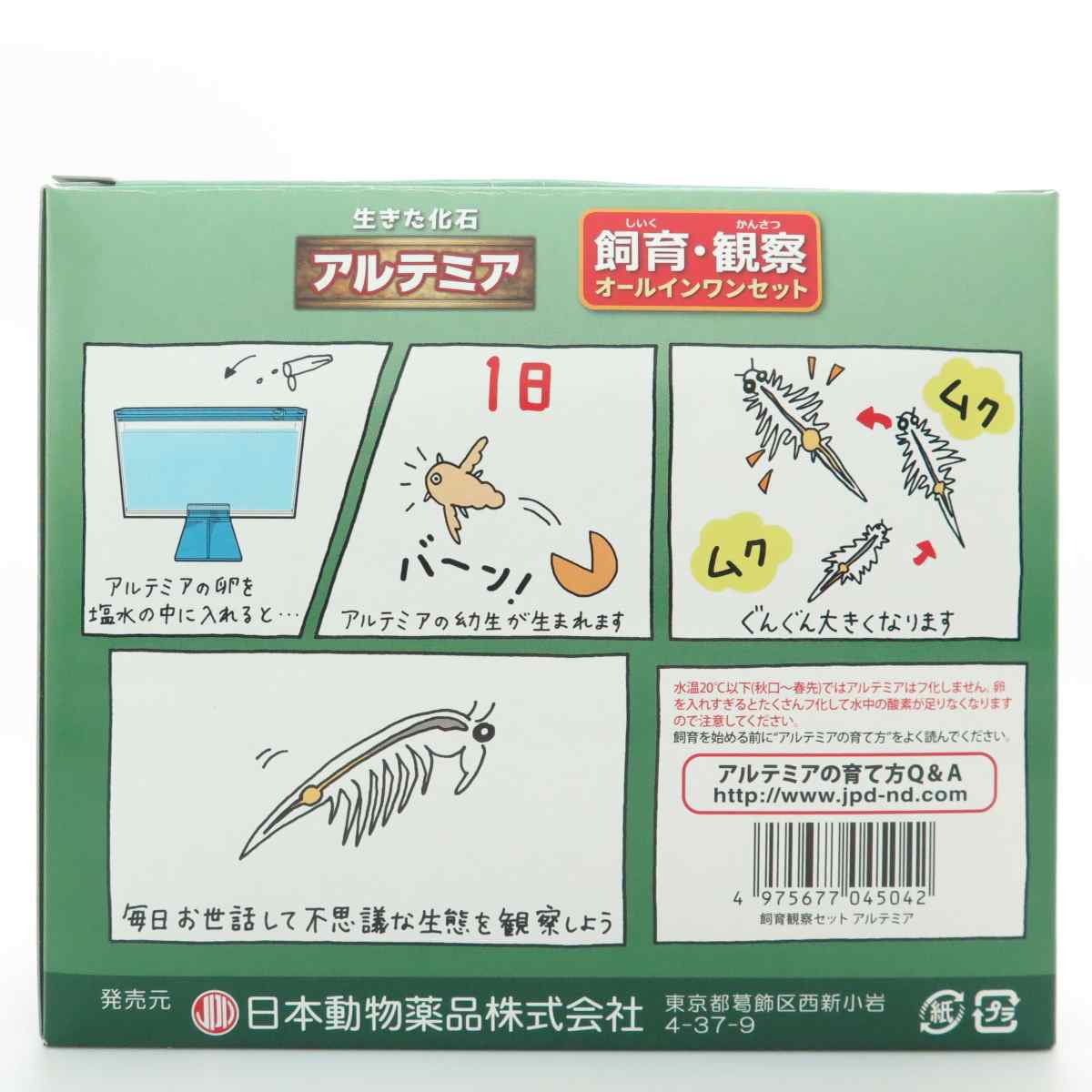 本品の中には、アルテミアの飼育に必要な道具がセットになっています。卵を塩水に入れると1日でフ化し、どんどん成長します。アルテミアを元気に育てるために、本品に入っている“アルテミアの育て方”をよく読んでください。約1ヶ月で1センチぐらいの大きさに成長します。