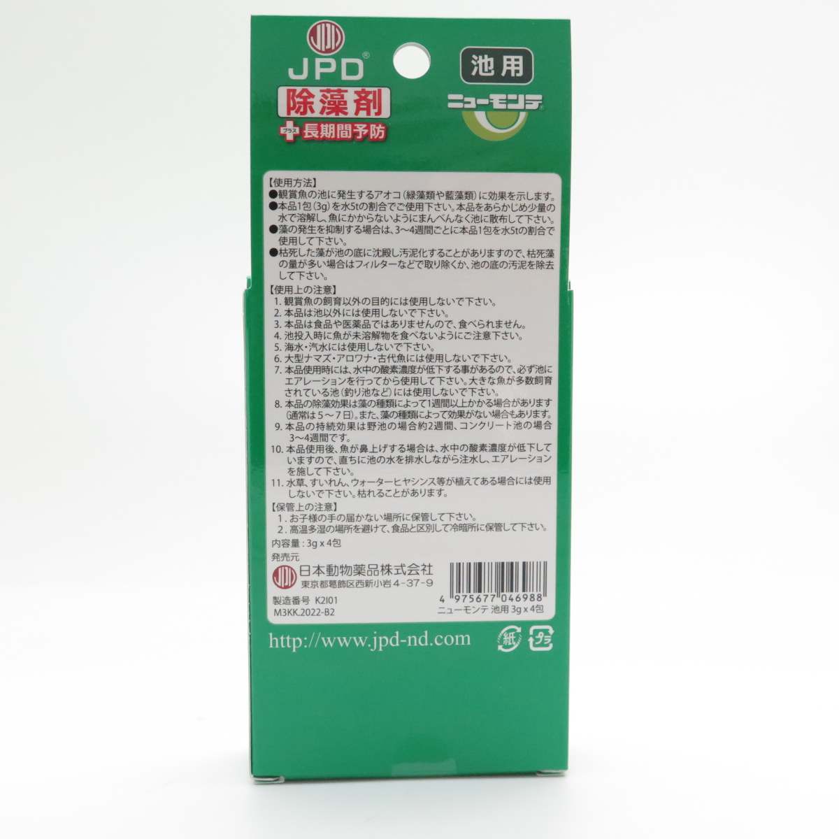 ●観賞魚の池に発生するアオコ(緑藻類や藍藻類)に効果を示します。●本品1包(3g)を水5tの割合でご使用下さい。本品をあらかじめ少量の水で溶解し、魚にかからないようにまんべんなく池に散布して下さい。●藻の発生を抑制する場合は、3~4週間ごとに本品1包を水5tの割合で使用して下さい。●枯死した藻が池の底に沈殿し汚泥化することがありますので、枯死藻の量が多い場合はフィルターなどで取り除くか、池の底の汚泥を除去して下さい。