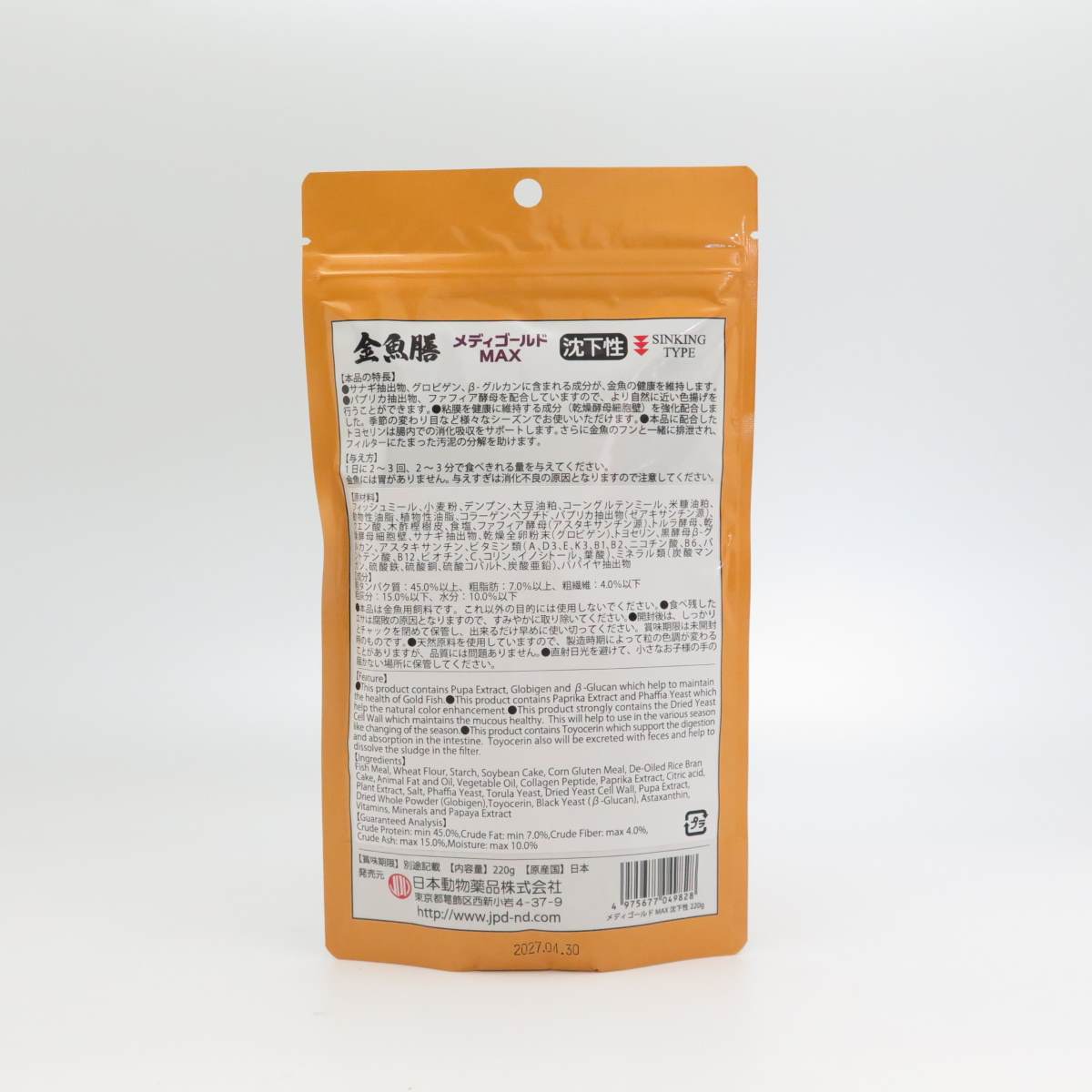 使用上の注意●本品は金魚用飼料です。これ以外の目的には使用しないでください。●食べ残したエサは腐敗の原因となりますので、すみやかに取り除いてください。●開封後は、しっかりとチャックを閉めて保管し、出来るだけ早めに使い切ってください。賞味期限は未開封時のものです。●天然原料を使用していますので、製造時期によって粒の色調が変わることがありますが、品質には問題ありません。●直射日光を避けて、小さなお子様の手の届かない場所に保管してください。