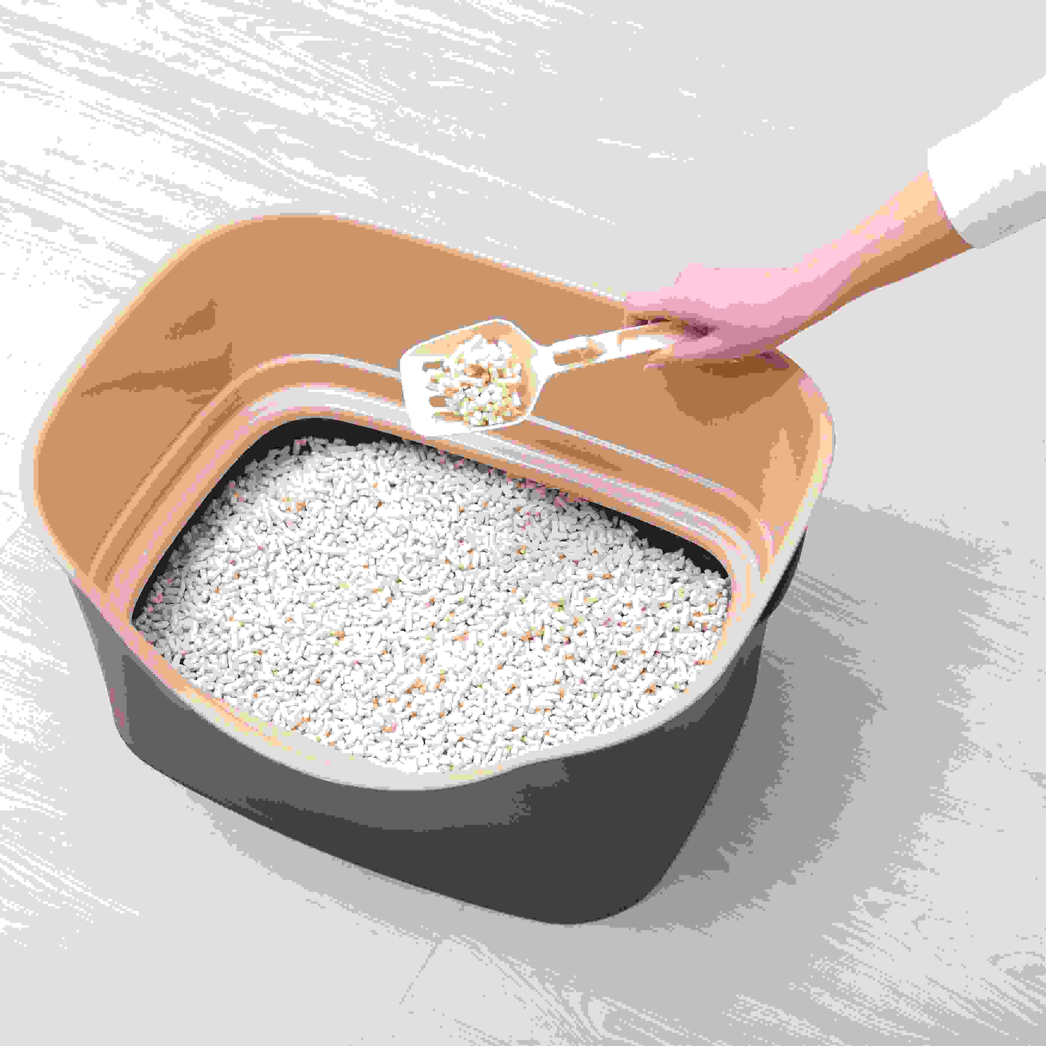 カバーとトレーの二重構造で、気になる猫砂の飛び散りをブロックできる猫用トイレ。トイレの内側は足場付きで、猫砂を足に付けたくないキレイ好きな猫ちゃんでも快適に使えます。カバーとトレーは簡単につけ外し可能。凹凸が少なく、お手入れしやすい形状です。大き目のねこちゃんでも使いやすく、猫用サークルの中にもスッキリ納まるサイズ設計です。●専用スコップ付属
