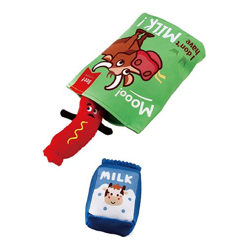 スクィーカーとカシャカシャ音が鳴るクリンクル素材、それぞれが入った2つのミニトーイを袋の中に隠して遊べるドッグトーイです。