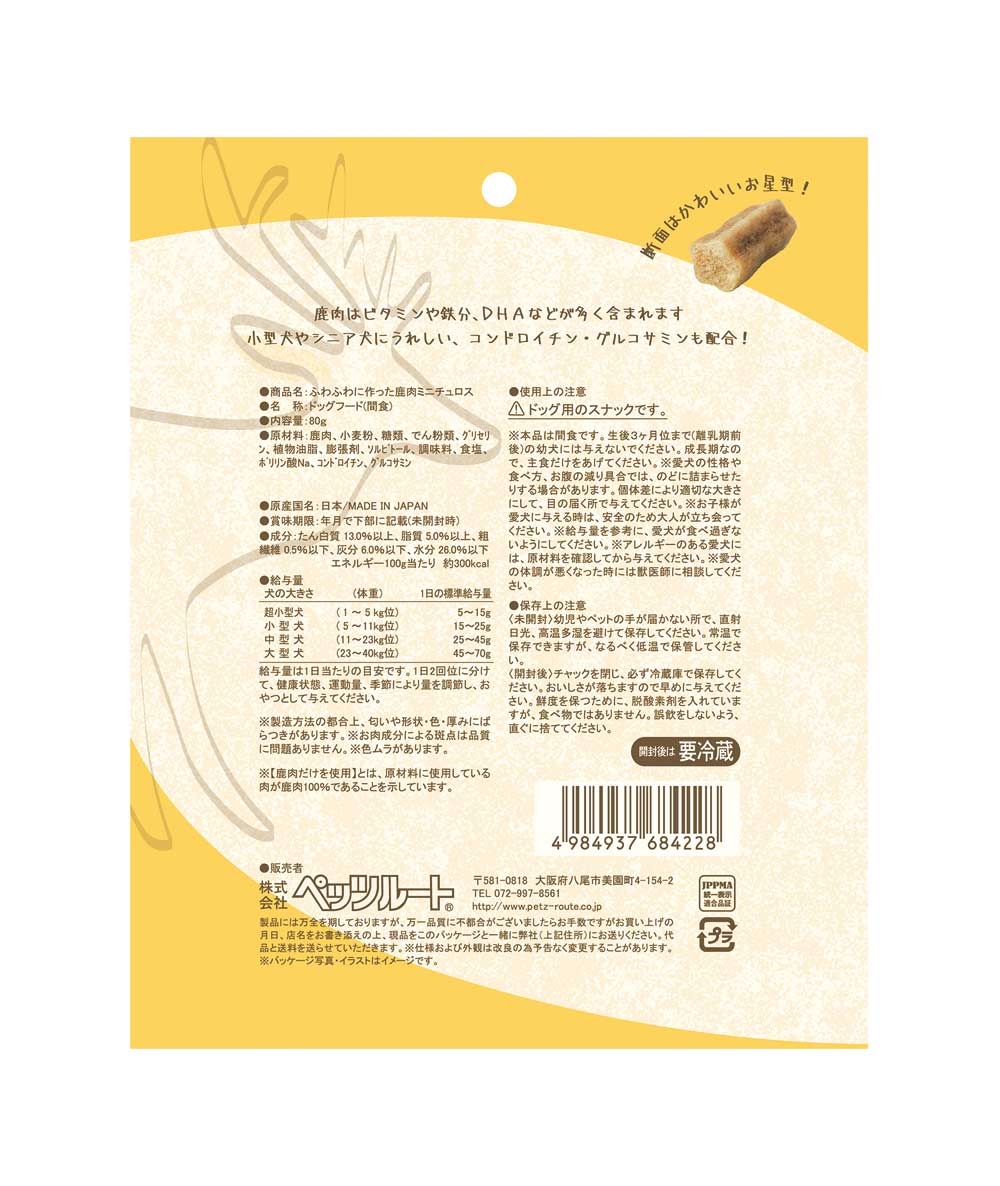 お肉は鹿肉だけを使用。 ふんわりやわらかい食感にしました! 保存料・合成着色料・発色剤・酸化防止剤無添加。 鹿肉にはビタミンや鉄分、DHAなどが多く含まれており、小型犬やシニア犬にうれしいコンドロイチンとグルコサミンを配合しました! ●製造方法の都合上、匂いや形状・色・厚みにばらつきがあります。 ●お肉成分による斑点は品質に問題ありません。 ●色ムラがあります。 ●【鹿肉だけを使用】とは、原材料に使用している肉が鹿肉100%であることを示しています。