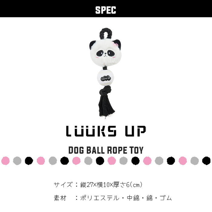 頭にお花の飾りを付けたキュートなパンダのボール付きロープトイ。 ロープは直径約1cmと、子犬や小型犬にピッタリのサイズになっています。