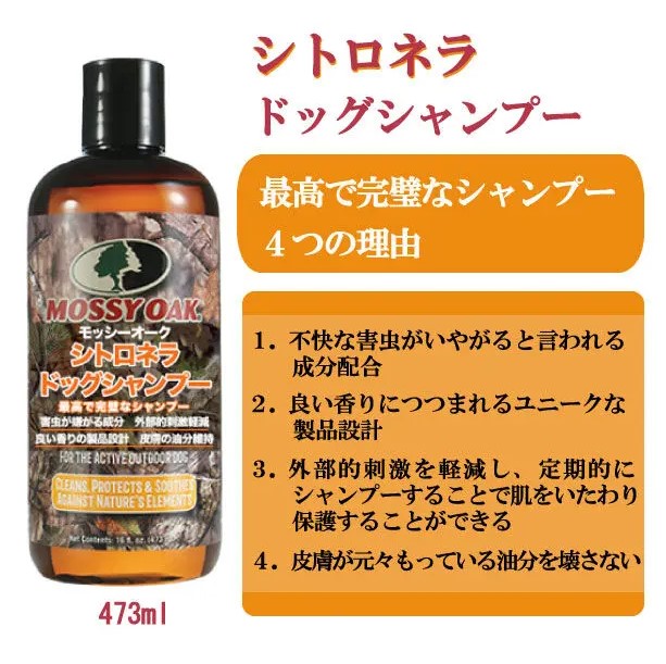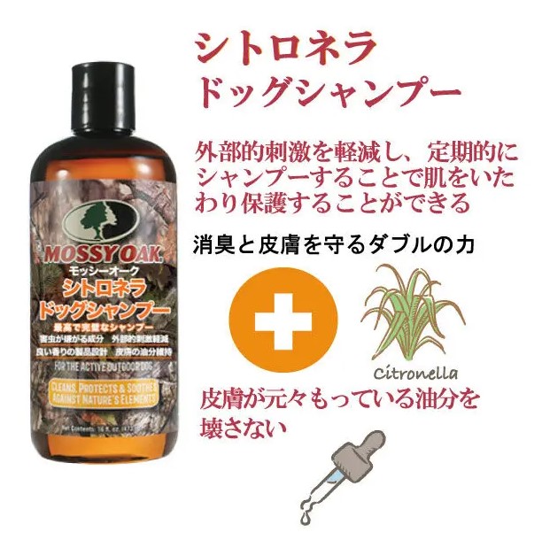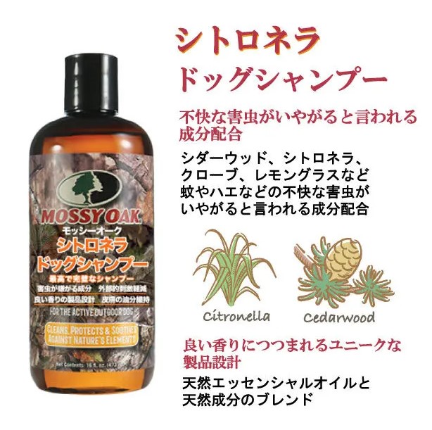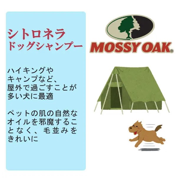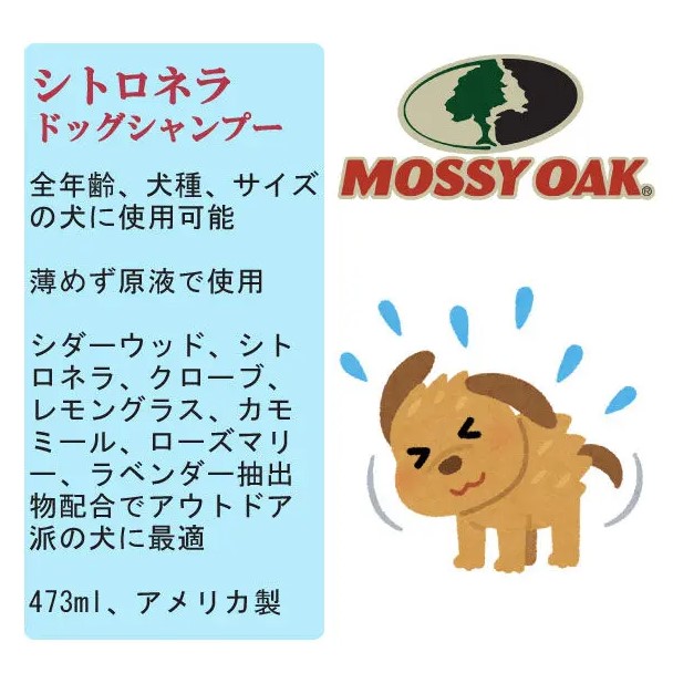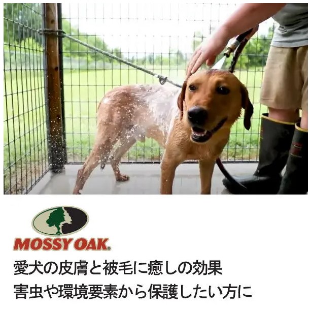 アウトドア派のワンちゃんにぴったりです。シダーウッド、シトロネラ、クローブ、レモングラスなど、蚊やハエなどの不快な害虫を寄せ付けないといわれる天然成分配合。さらに、あなたのワンちゃんもいい香りに包まれるはずです。このユニークな処方は、かぶれや虫刺され、環境過敏症などによる皮膚の炎症の対策として良いといわれる成分で設計されています。定期的にシャンプーをすることで、ワンちゃんの肌をいたわり、保護することができます。・すべての年齢、犬種、サイズのワンちゃんに安全です。・ハイキングやキャンプなど、屋外で過ごすことが多い犬に最適です。ペットの自然なオイルを邪魔することなく、毛並みをきれいにするのに十分な優しさがあり、アウトドア派の犬のための保護膜を追加します。・アウトドア派の愛犬にぴったりの香り・愛犬の皮膚と被毛に癒しの効果をもたらす・不要な害虫や環境要素から保護することができる・モシーオークの商標に基づいたデザイン【使用方法】薄めず原液で使用。全年齢、犬種、サイズの犬に使用可能。