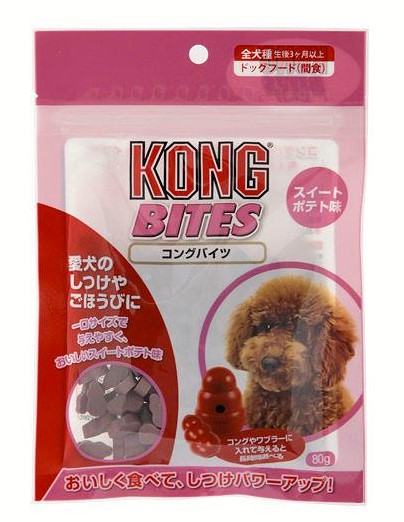 ●コングのしつけ用玩具やワブラーと組み合わせれば、愛犬のしつけや知育に役立ちます。●おいしいスイートポテト味。●消化に良く、歯に優しい噛みごこち。●おなかにやさしいオリゴ糖入り。●コングワブラーの正面の穴にぴったりサイズ。●与える量は、幼犬・超小型犬で5~10粒、小型犬で10~20粒、中型犬で20~40粒、大型犬で40~60粒となります。<原材料>米タンパク、増粘安定剤(グリセリン)、ゼラチン、デンプン、パイナップル繊維、 スイートポテト、香料、植物性油脂、ミネラル類(Ca)、 着色料(酸化チタン、赤40、青1)、オリゴ糖、酵素、保存料(プロピオン酸)、ビタミンE<成分表>粗タンパク質:20.0%以上、粗脂肪:3.0%以上、粗繊維:3.0%以下、粗灰分:5.0%以下、水分:15.0%以下<カロリー>300kcal / 100g<容量>80g<対象>生後3ヶ月以上(全犬種)〇そばにいつも新鮮な水を用意してください。〇のどに詰まらせないよう観察しながら、ゆっくり与えてください。〇本品を与えた場合は、主食を2割ほど減らしてください。〇おやつの切り替えは少量から始めてください。〇コング・ワブラー等で遊んだ後はそれらを良く洗ってください。≪ご注意≫※生後3ヶ月未満の犬には与えないでください。※犬以外に食べさせないでください。※粒中の白いものは、パイナップル繊維ですので、ご安心ください。※直射日光、高温多湿の場所では保管しないでください。※開封した後は必ず密封し、なるべく早く使い切ってください。※同封の乾燥剤(シリカゲル)は食べられません。※食物アレルギーや体調不良の場合は、与える前に獣医師にご相談ください。